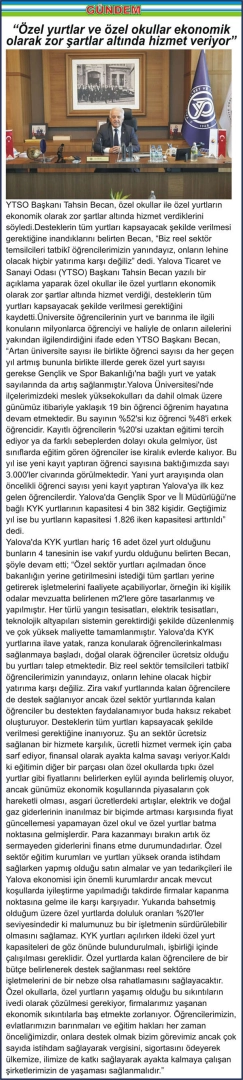 YTSO Başkanı Tahsin Becan, özel okullar ile özel yurtların ekonomik olarak zor şartlar altında hizmet verdiklerini söyledi.Desteklerin tüm yurtları kapsayacak şekilde verilmesi gerektiğine inandıklarını belirten Becan, “Biz reel sektör temsilcileri tatbikî öğrencilerimizin yanındayız, onların lehine olacak hiçbir yatırıma karşı değiliz” dedi. Yalova Ticaret ve Sanayi Odası (YTSO) Başkanı Tahsin Becan yazılı bir açıklama yaparak özel okullar ile özel yurtların ekonomik olarak zor şartlar altında hizmet verdiği, desteklerin tüm yurtları kapsayacak şekilde verilmesi gerektiğini kaydetti.Üniversite öğrencilerinin yurt ve barınma ile ilgili konuların milyonlarca öğrenciyi ve haliyle de onların ailelerini yakından ilgilendirdiğini ifade eden YTSO Başkanı Becan, “Artan üniversite sayısı ile birlikte öğrenci sayısı da her geçen yıl artmış bununla birlikte illerde gerek özel yurt sayısı gerekse Gençlik ve Spor Bakanlığı’na bağlı yurt ve yatak sayılarında da artış sağlanmıştır.Yalova Üniversitesi’nde ilçelerimizdeki meslek yüksekokulları da dahil olmak üzere günümüz itibariyle yaklaşık 19 bin öğrenci öğrenim hayatına devam etmektedir. Bu sayının %52’si kız öğrenci %48’i erkek öğrencidir. Kayıtlı öğrencilerin %20’si uzaktan eğitimi tercih ediyor ya da farklı sebeplerden dolayı okula gelmiyor, üst sınıflarda eğitim gören öğrenciler ise kiralık evlerde kalıyor. Bu yıl ise yeni kayıt yaptıran öğrenci sayısına baktığımızda sayı 3.000’ler civarında görülmektedir. Yani yurt arayışında olan öncelikli öğrenci sayısı yeni kayıt yaptıran Yalova’ya ilk kez gelen öğrencilerdir. Yalova’da Gençlik Spor ve İl Müdürlüğü’ne bağlı KYK yurtlarının kapasitesi 4 bin 382 kişidir. Geçtiğimiz yıl ise bu yurtların kapasitesi 1.826 iken kapasitesi arttırıldı” dedi.