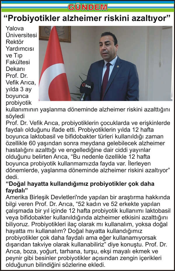 Yalova Üniversitesi Rektör Yardımcısı ve Tıp Fakültesi Dekanı Prof. Dr. Vefik Arıca, yılda 3 ay boyunca probiyotik kullanımının yaşlanma döneminde alzheimer riskini azalttığını söyledi Prof. Dr. Vefik Arıca, probiyotiklerin çocuklarda ve erişkinlerde faydalı olduğunu ifade etti. Probiyotiklerin yılda 12 hafta boyunca laktobasil ve bifidobakter türleri kullanıldığı zaman özellikle 60 yaşından sonra meydana gelebilecek alzheimer hastalığını azalttığı ve engellediğine dair ciddi yayınlar olduğunu belirten Arıca, “Bu nedenle özellikle 12 hafta boyunca probiyotik kullanmamızda fayda var. İlerleyen dönemlerde, yaşlanma döneminde alzheimer riskini azaltıyor” dedi. “Doğal hayatta kullandığımız probiyotikler çok daha faydalı” Amerika Birleşik Devletleri'nde yapılan bir araştırma hakkında bilgi veren Prof. Dr. Arıca, “52 kadın ve 52 erkekte yapılan çalışmada bir yıl içinde 12 hafta probiyotik kullanımı laktobasil veya bifidobakter kullanıldığında alzheimer etkisini azalttığını biliyoruz. Probiyotikleri ilaç olarak mı kullanalım, yoksa doğal hayatta mı kullanalım? Doğal hayatta kullandığımız probiyotikler çok daha faydalı ama eğer kullanamıyorsak dışarıdan takviye olarak kullanabiliriz” diye konuştu. Prof. Dr. Arıca, boza, yoğurt, tarhana, turşu, ekşi mayalı ekmek ve peynir gibi besinler probiyotikler açısından zengin içerikleri olduğunun bilindiğini sözlerine ekledi.
