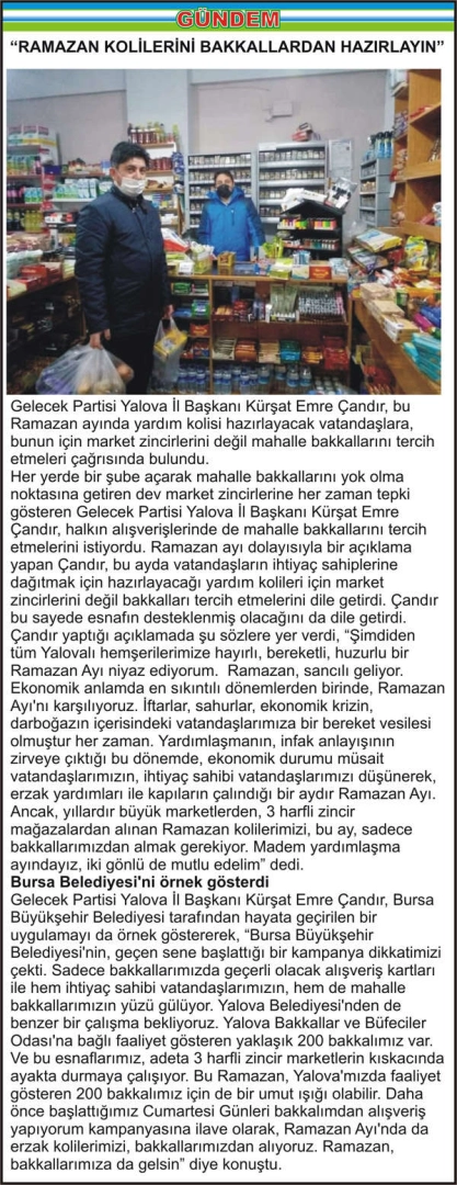 Gelecek Partisi Yalova İl Başkanı Kürşat Emre Çandır, bu Ramazan ayında yardım kolisi hazırlayacak vatandaşlara, bunun için market zincirlerini değil mahalle bakkallarını tercih etmeleri çağrısında bulundu.