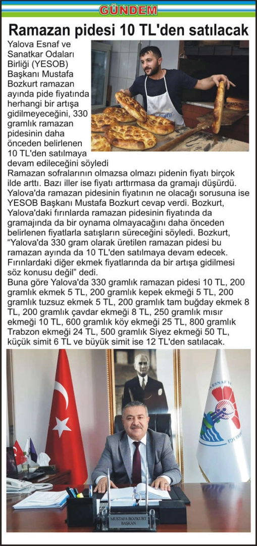 Yalova Esnaf ve Sanatkar Odaları Birliği (YESOB) Başkanı Mustafa Bozkurt ramazan ayında pide fiyatında herhangi bir artışa gidilmeyeceğini, 330 gramlık ramazan pidesinin daha önceden belirlenen 10 TL’den satılmaya devam edileceğini söyledi Ramazan sofralarının olmazsa olmazı pidenin fiyatı birçok ilde arttı. Bazı iller ise fiyatı arttırmasa da gramajı düşürdü. Yalova’da ramazan pidesinin fiyatının ne olacağı sorusuna ise YESOB Başkanı Mustafa Bozkurt cevap verdi. Bozkurt, Yalova’daki fırınlarda ramazan pidesinin fiyatında da gramajında da bir oynama olmayacağını daha önceden belirlenen fiyatlarla satışların süreceğini söyledi. Bozkurt, “Yalova’da 330 gram olarak üretilen ramazan pidesi bu ramazan ayında da 10 TL’den satılmaya devam edecek. Fırınlardaki diğer ekmek fiyatlarında da bir artışa gidilmesi söz konusu değil” dedi. Buna göre Yalova’da 330 gramlık ramazan pidesi 10 TL, 200 gramlık ekmek 5 TL, 200 gramlık kepek ekmeği 5 TL, 200 gramlık tuzsuz ekmek 5 TL, 200 gramlık tam buğday ekmek 8 TL, 200 gramlık çavdar ekmeği 8 TL, 250 gramlık mısır ekmeği 10 TL, 600 gramlık köy ekmeği 25 TL, 800 gramlık Trabzon ekmeği 24 TL, 500 gramlık Siyez ekmeği 50 TL, küçük simit 6 TL ve büyük simit ise 12 TL’den satılacak.