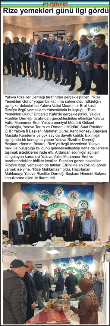 Yalova Rizeliler Derneği tarafından gerçekleştirilen, “Rize Yemekleri Günü” yoğun bir katılıma sahne oldu. Etkinliğin açılış kurdelesini ise Yalova Valisi Muammer Erol kesti.