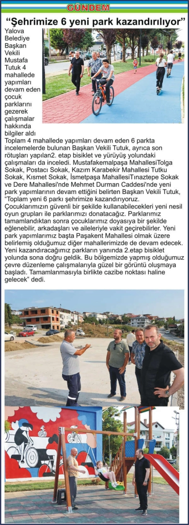 Yalova Belediye Başkan Vekili Mustafa Tutuk 4 mahallede yapımları devam eden çocuk parklarını gezerek çalışmalar hakkında bilgiler aldı Toplam 4 mahallede yapımları devam eden 6 parkta incelemelerde bulunan Başkan Vekili Tutuk, ayrıca son rötuşları yapılan2. etap bisiklet ve yürüyüş yolundaki çalışmaları da inceledi. Mustafakemalpaşa MahallesiTolga Sokak, Postacı Sokak, Kazım Karabekir Mahallesi Tutku Sokak, Kısmet Sokak, İsmetpaşa MahallesiTınaztepe Sokak ve Dere Mahallesi’nde Mehmet Durman Caddesi’nde yeni park yapımlarının devam ettiğini belirten Başkan Vekili Tutuk, “Toplam yeni 6 parkı şehrimize kazandırıyoruz. Çocuklarımızın güvenli bir şekilde kullanabilecekleri yeni nesil oyun grupları ile parklarımızı donatacağız. Parklarımız tamamlandıktan sonra çocuklarımız doyasıya bir şekilde eğlenebilir, arkadaşları ve aileleriyle vakit geçirebilirler. Yeni park yapımlarımız başta Paşakent Mahallesi olmak üzere belirlemiş olduğumuz diğer mahallerimizde de devam edecek. Yeni kazandıracağımız parkların yanında 2.etap bisiklet yolunda sona doğru geldik. Bu bölgemizde yapmış olduğumuz çevre düzenleme çalışmalarıyla güzel bir görüntü oluşmaya başladı. Tamamlanmasıyla birlikte cazibe noktası haline gelecek” dedi.