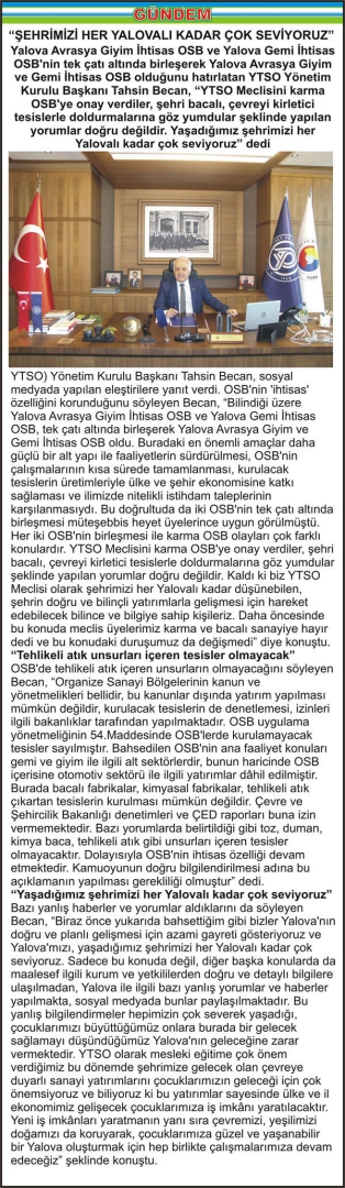 YTSO) Yönetim Kurulu Başkanı Tahsin Becan, sosyal medyada yapılan eleştirilere yanıt verdi. OSB’nin ‘ihtisas’ özelliğini korunduğunu söyleyen Becan, “Bilindiği üzere Yalova Avrasya Giyim İhtisas OSB ve Yalova Gemi İhtisas OSB, tek çatı altında birleşerek Yalova Avrasya Giyim ve Gemi İhtisas OSB oldu. Buradaki en önemli amaçlar daha güçlü bir alt yapı ile faaliyetlerin sürdürülmesi, OSB’nin çalışmalarının kısa sürede tamamlanması, kurulacak tesislerin üretimleriyle ülke ve şehir ekonomisine katkı sağlaması ve ilimizde nitelikli istihdam taleplerinin karşılanmasıydı. Bu doğrultuda da iki OSB’nin tek çatı altında birleşmesi müteşebbis heyet üyelerince uygun görülmüştü. Her iki OSB’nin birleşmesi ile karma OSB olayları çok farklı konulardır. YTSO Meclisini karma OSB’ye onay verdiler, şehri bacalı, çevreyi kirletici tesislerle doldurmalarına göz yumdular şeklinde yapılan yorumlar doğru değildir. Kaldı ki biz YTSO Meclisi olarak şehrimizi her Yalovalı kadar düşünebilen, şehrin doğru ve bilinçli yatırımlarla gelişmesi için hareket edebilecek bilince ve bilgiye sahip kişileriz. Daha öncesinde bu konuda meclis üyelerimiz karma ve bacalı sanayiye hayır dedi ve bu konudaki duruşumuz da değişmedi” diye konuştu.