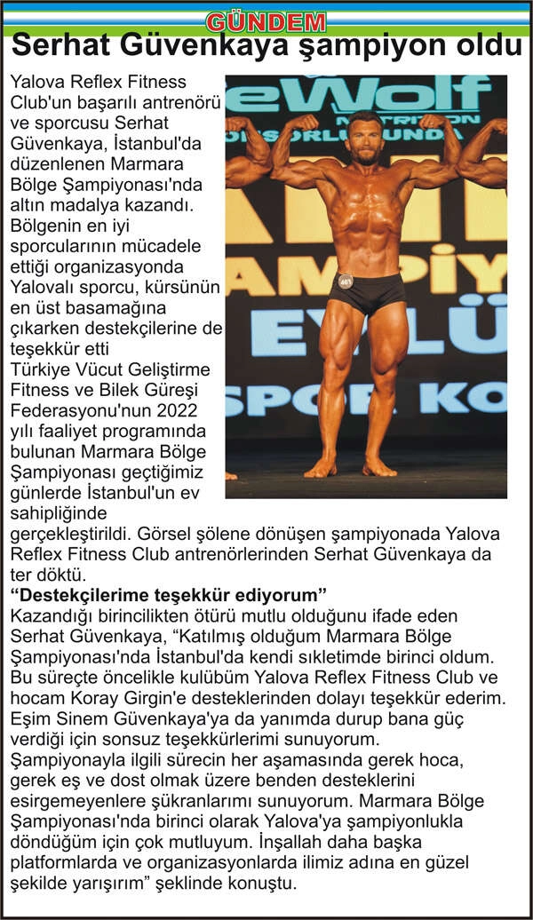 Yalova Reflex Fitness Club’un başarılı antrenörü ve sporcusu Serhat Güvenkaya, İstanbul’da düzenlenen Marmara Bölge Şampiyonası’nda altın madalya kazandı. Bölgenin en iyi sporcularının mücadele ettiği organizasyonda Yalovalı sporcu, kürsünün en üst basamağına çıkarken destekçilerine de teşekkür etti