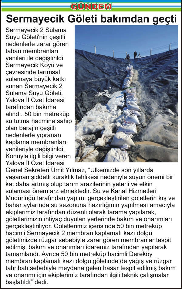 Sermayecik 2 Sulama Suyu Göleti’nin çeşitli nedenlerle zarar gören taban membranları yenileri ile değiştirildi Sermayecik Köyü ve çevresinde tarımsal sulamaya büyük katkı sunan Sermayecik 2 Sulama Suyu Göleti, Yalova İl Özel İdaresi tarafından bakıma alındı. 50 bin metreküp su tutma hacmine sahip olan barajın çeşitli nedenlerle yıpranan kaplama membranları yenileriyle değiştirildi. Konuyla ilgili bilgi veren Yalova İl Özel İdaresi Genel Sekreteri Ümit Yılmaz, “Ülkemizde son yıllarda yaşanan şiddetli kuraklık tehlikesi nedeniyle suyun önemi bir kat daha artmış olup tarım arazilerinin yeterli ve etkin sulaması önem arz etmektedir. Su ve Kanal Hizmetleri Müdürlüğü tarafından yapımı gerçekleştirilen göletlerin kış ve bahar aylarında su sezonuna hazırlığının yapılması amacıyla ekiplerimiz tarafından düzenli olarak tarama yapılarak, göletlerimizin ihtiyaç duyulan yerlerinde bakım ve onarımları gerçekleştiriliyor. Göletlerimiz içerisinde 50 bin metreküp hacimli Sermayecik 2 membran kaplamalı kazı dolgu göletimizde rüzgar sebebiyle zarar gören membranlar tespit edilmiş, bakım ve onarımları idaremiz tarafından yapılarak tamamlandı. Ayrıca 50 bin metreküp hacimli Dereköy membran kaplamalı kazı dolgu göletinde de yağış ve rüzgar tahribatı sebebiyle meydana gelen hasar tespit edilmiş bakım ve onarımı için ekiplerimiz tarafından ilgili teknik çalışmalar başlatıldı” dedi.