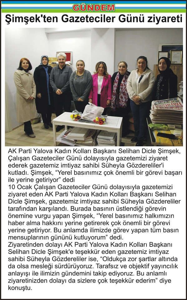 AK Parti Yalova Kadın Kolları Başkanı Selihan Dicle Şimşek, Çalışan Gazeteciler Günü dolayısıyla gazetemizi ziyaret ederek gazetemiz imtiyaz sahibi Süheyla Gözdereliler’i kutladı. Şimşek, “Yerel basınımız çok önemli bir görevi başarı ile yerine getiriyor” dedi