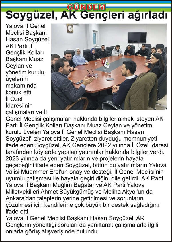 Yalova İl Genel Meclisi Başkanı Hasan Soygüzel, AK Parti İl Gençlik Kolları Başkanı Muaz Ceylan ve yönetim kurulu üyelerini makamında konuk etti İl Özel İdaresi’nin çalışmaları ve İl Genel Meclisi çalışmaları hakkında bilgiler almak isteyen AK Parti İl Gençlik Kolları Başkanı Muaz Ceylan ve yönetim kurulu üyeleri Yalova İl Genel Meclisi Başkanı Hasan Soygüzel’i ziyaret ettiler. Ziyaretten duyduğu memnuniyeti ifade eden Soygüzel, AK Gençlere 2022 yılında İl Özel İdaresi tarafından köylerde yapılan yatırımlar hakkında bilgiler verdi. 2023 yılında da yeni yatırımların ve projelerin hayata geçeceğini ifade eden Soygüzel, bütün bu yatırımların Yalova Valisi Muammer Erol’un onay ve desteği, İl Genel Meclisi’nin uyumlu çalışması ile hayata geçirildiğini dile getirdi. AK Parti Yalova İl Başkanı Muğlim Bağatar ve AK Parti Yalova Milletvekilleri Ahmet Büyükgümüş ve Meliha Akyol’un da Ankara’dan taleplerin yerine getirilmesi ve sorunların çözülmesi için kendilerine çok büyük bir destek sağladığını ifade etti. Yalova İl Genel Meclisi Başkanı Hasan Soygüzel, AK Gençlerin yönelttiği soruları da yanıltarak çalışmalarla ilgili onlarla görüş alışverişinde bulundu.