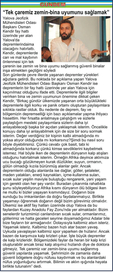 Yalova Jeofizik Mühendisleri Odası Başkanı Osman Kendir fay hattı üzerinde yer alan Yalova’da depremlerindaima olacağını hatırlattı. Kendir, depremlerde can ve mal kaybının önlenmesi için tek çarenin ise zemin ve bina uyumu sağlanmış güvenli binalar inşa etmekten geçtiğini söyledi