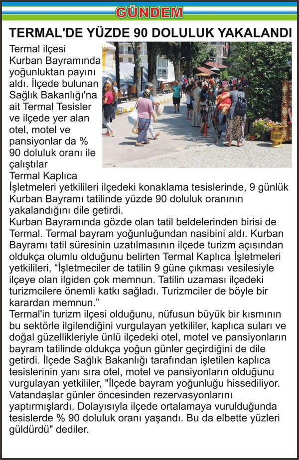 Termal ilçesi Kurban Bayramında yoğunluktan payını aldı. İlçede bulunan Sağlık Bakanlığı’na ait Termal Tesisler ve ilçede yer alan otel, motel ve pansiyonlar da % 90 doluluk oranı ile çalıştılar Termal Kaplıca İşletmeleri yetkilileri ilçedeki konaklama tesislerinde, 9 günlük Kurban Bayramı tatilinde yüzde 90 doluluk oranının yakalandığını dile getirdi. Kurban Bayramında gözde olan tatil beldelerinden birisi de Termal. Termal bayram yoğunluğundan nasibini aldı. Kurban Bayramı tatil süresinin uzatılmasının ilçede turizm açısından oldukça olumlu olduğunu belirten Termal Kaplıca İşletmeleri yetkilileri, “İşletmeciler de tatilin 9 güne çıkması vesilesiyle ilçeye olan ilgiden çok memnun. Tatilin uzaması ilçedeki turizmcilere önemli katkı sağladı. Turizmciler de böyle bir karardan memnun.” Termal'in turizm ilçesi olduğunu, nüfusun büyük bir kısmının bu sektörle ilgilendiğini vurgulayan yetkililer, kaplıca suları ve doğal güzellikleriyle ünlü ilçedeki otel, motel ve pansiyonların bayram tatilinde oldukça yoğun günler geçirdiğini de dile getirdi. İlçede Sağlık Bakanlığı tarafından işletilen kaplıca tesislerinin yanı sıra otel, motel ve pansiyonların olduğunu vurgulayan yetkililer, "İlçede bayram yoğunluğu hissediliyor. Vatandaşlar günler öncesinden rezervasyonlarını yaptırmışlardı. Dolayısıyla ilçede ortalamaya vurulduğunda tesislerde % 90 doluluk oranı yaşandı. Bu da elbette yüzleri güldürdü" dediler.