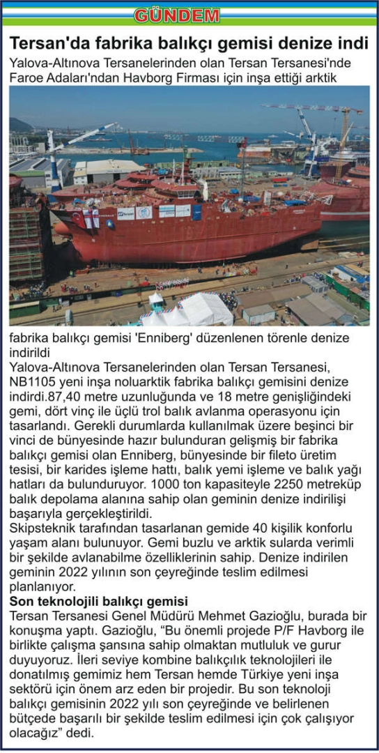 Yalova-Altınova Tersanelerinden olan Tersan Tersanesi’nde Faroe Adaları’ndan Havborg Firması için inşa ettiği arktik fabrika balıkçı gemisi ‘Enniberg’ düzenlenen törenle denize indirildi Yalova-Altınova Tersanelerinden olan Tersan Tersanesi, NB1105 yeni inşa noluarktik fabrika balıkçı gemisini denize indirdi.87,40 metre uzunluğunda ve 18 metre genişliğindeki gemi, dört vinç ile üçlü trol balık avlanma operasyonu için tasarlandı. Gerekli durumlarda kullanılmak üzere beşinci bir vinci de bünyesinde hazır bulunduran gelişmiş bir fabrika balıkçı gemisi olan Enniberg, bünyesinde bir fileto üretim tesisi, bir karides işleme hattı, balık yemi işleme ve balık yağı hatları da bulunduruyor. 1000 ton kapasiteyle 2250 metreküp balık depolama alanına sahip olan geminin denize indirilişi başarıyla gerçekleştirildi. Skipsteknik tarafından tasarlanan gemide 40 kişilik konforlu yaşam alanı bulunuyor. Gemi buzlu ve arktik sularda verimli bir şekilde avlanabilme özelliklerinin sahip. Denize indirilen geminin 2022 yılının son çeyreğinde teslim edilmesi planlanıyor. Son teknolojili balıkçı gemisi Tersan Tersanesi Genel Müdürü Mehmet Gazioğlu, burada bir konuşma yaptı. Gazioğlu, “Bu önemli projede P/F Havborg ile birlikte çalışma şansına sahip olmaktan mutluluk ve gurur duyuyoruz. İleri seviye kombine balıkçılık teknolojileri ile donatılmış gemimiz hem Tersan hemde Türkiye yeni inşa sektörü için önem arz eden bir projedir. Bu son teknoloji balıkçı gemisinin 2022 yılı son çeyreğinde ve belirlenen bütçede başarılı bir şekilde teslim edilmesi için çok çalışıyor olacağız” dedi.