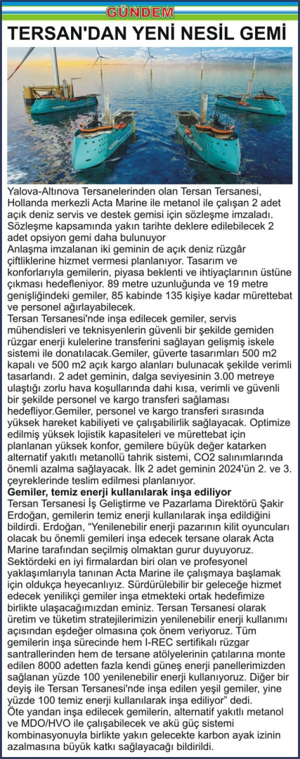 Yalova-Altınova Tersanelerinden olan Tersan Tersanesi, Hollanda merkezli Acta Marine ile metanol ile çalışan 2 adet açık deniz servis ve destek gemisi için sözleşme imzaladı. Sözleşme kapsamında yakın tarihte deklere edilebilecek 2 adet opsiyon gemi daha bulunuyor Anlaşma imzalanan iki geminin de açık deniz rüzgâr çiftliklerine hizmet vermesi planlanıyor. Tasarım ve konforlarıyla gemilerin, piyasa beklenti ve ihtiyaçlarının üstüne çıkması hedefleniyor. 89 metre uzunluğunda ve 19 metre genişliğindeki gemiler, 85 kabinde 135 kişiye kadar mürettebat ve personel ağırlayabilecek. Tersan Tersanesi’nde inşa edilecek gemiler, servis mühendisleri ve teknisyenlerin güvenli bir şekilde gemiden rüzgar enerji kulelerine transferini sağlayan gelişmiş iskele sistemi ile donatılacak.Gemiler, güverte tasarımları 500 m2 kapalı ve 500 m2 açık kargo alanları bulunacak şekilde verimli tasarlandı. 2 adet geminin, dalga seviyesinin 3.00 metreye ulaştığı zorlu hava koşullarında dahi kısa, verimli ve güvenli bir şekilde personel ve kargo transferi sağlaması hedefliyor.Gemiler, personel ve kargo transferi sırasında yüksek hareket kabiliyeti ve çalışabilirlik sağlayacak. Optimize edilmiş yüksek lojistik kapasiteleri ve mürettebat için planlanan yüksek konfor, gemilere büyük değer katarken alternatif yakıtlı metanollü tahrik sistemi, CO2 salınımlarında önemli azalma sağlayacak. İlk 2 adet geminin 2024’ün 2. ve 3. çeyreklerinde teslim edilmesi planlanıyor. Gemiler, temiz enerji kullanılarak inşa ediliyor Tersan Tersanesi İş Geliştirme ve Pazarlama Direktörü Şakir Erdoğan, gemilerin temiz enerji kullanılarak inşa edildiğini bildirdi. Erdoğan, “Yenilenebilir enerji pazarının kilit oyuncuları olacak bu önemli gemileri inşa edecek tersane olarak Acta Marine tarafından seçilmiş olmaktan gurur duyuyoruz. Sektördeki en iyi firmalardan biri olan ve profesyonel yaklaşımlarıyla tanınan Acta Marine ile çalışmaya başlamak için oldukça heyecanlıyız. Sürdürülebilir bir geleceğe hizmet edecek yenilikçi gemiler inşa etmekteki ortak hedefimize birlikte ulaşacağımızdan eminiz. Tersan Tersanesi olarak üretim ve tüketim stratejilerimizin yenilenebilir enerji kullanımı açısından eşdeğer olmasına çok önem veriyoruz. Tüm gemilerin inşa sürecinde hem I-REC sertifikalı rüzgar santrallerinden hem de tersane atölyelerinin çatılarına monte edilen 8000 adetten fazla kendi güneş enerji panellerimizden sağlanan yüzde 100 yenilenebilir enerji kullanıyoruz. Diğer bir deyiş ile Tersan Tersanesi'nde inşa edilen yeşil gemiler, yine yüzde 100 temiz enerji kullanılarak inşa ediliyor” dedi. Öte yandan inşa edilecek gemilerin, alternatif yakıtlı metanol ve MDO/HVO ile çalışabilecek ve akü güç sistemi kombinasyonuyla birlikte yakın gelecekte karbon ayak izinin azalmasına büyük katkı sağlayacağı bildirildi.