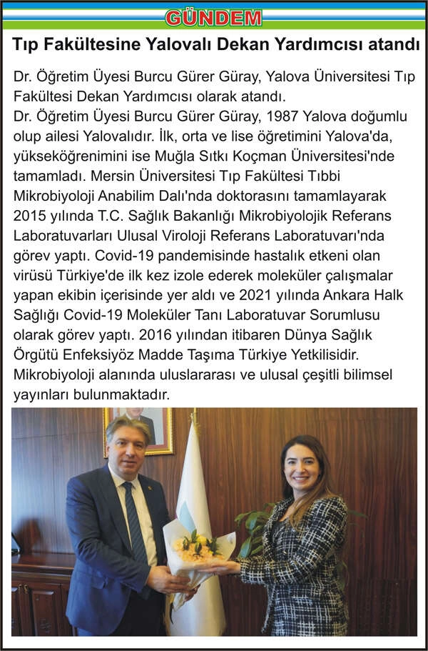 Dr. Öğretim Üyesi Burcu Gürer Güray, Yalova Üniversitesi Tıp Fakültesi Dekan Yardımcısı olarak atandı. Dr. Öğretim Üyesi Burcu Gürer Güray, 1987 Yalova doğumlu olup ailesi Yalovalıdır. İlk, orta ve lise öğretimini Yalova'da, yükseköğrenimini ise Muğla Sıtkı Koçman Üniversitesi'nde tamamladı. Mersin Üniversitesi Tıp Fakültesi Tıbbi Mikrobiyoloji Anabilim Dalı’nda doktorasını tamamlayarak 2015 yılında T.C. Sağlık Bakanlığı Mikrobiyolojik Referans Laboratuvarları Ulusal Viroloji Referans Laboratuvarı’nda görev yaptı. Covid-19 pandemisinde hastalık etkeni olan virüsü Türkiye’de ilk kez izole ederek moleküler çalışmalar yapan ekibin içerisinde yer aldı ve 2021 yılında Ankara Halk Sağlığı Covid-19 Moleküler Tanı Laboratuvar Sorumlusu olarak görev yaptı. 2016 yılından itibaren Dünya Sağlık Örgütü Enfeksiyöz Madde Taşıma Türkiye Yetkilisidir. Mikrobiyoloji alanında uluslararası ve ulusal çeşitli bilimsel yayınları bulunmaktadır.