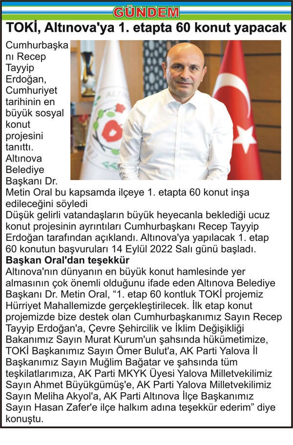 Cumhurbaşkanı Recep Tayyip Erdoğan, Cumhuriyet tarihinin en büyük sosyal konut projesini tanıttı. Altınova Belediye Başkanı Dr. Metin Oral bu kapsamda ilçeye 1. etapta 60 konut inşa edileceğini söyledi