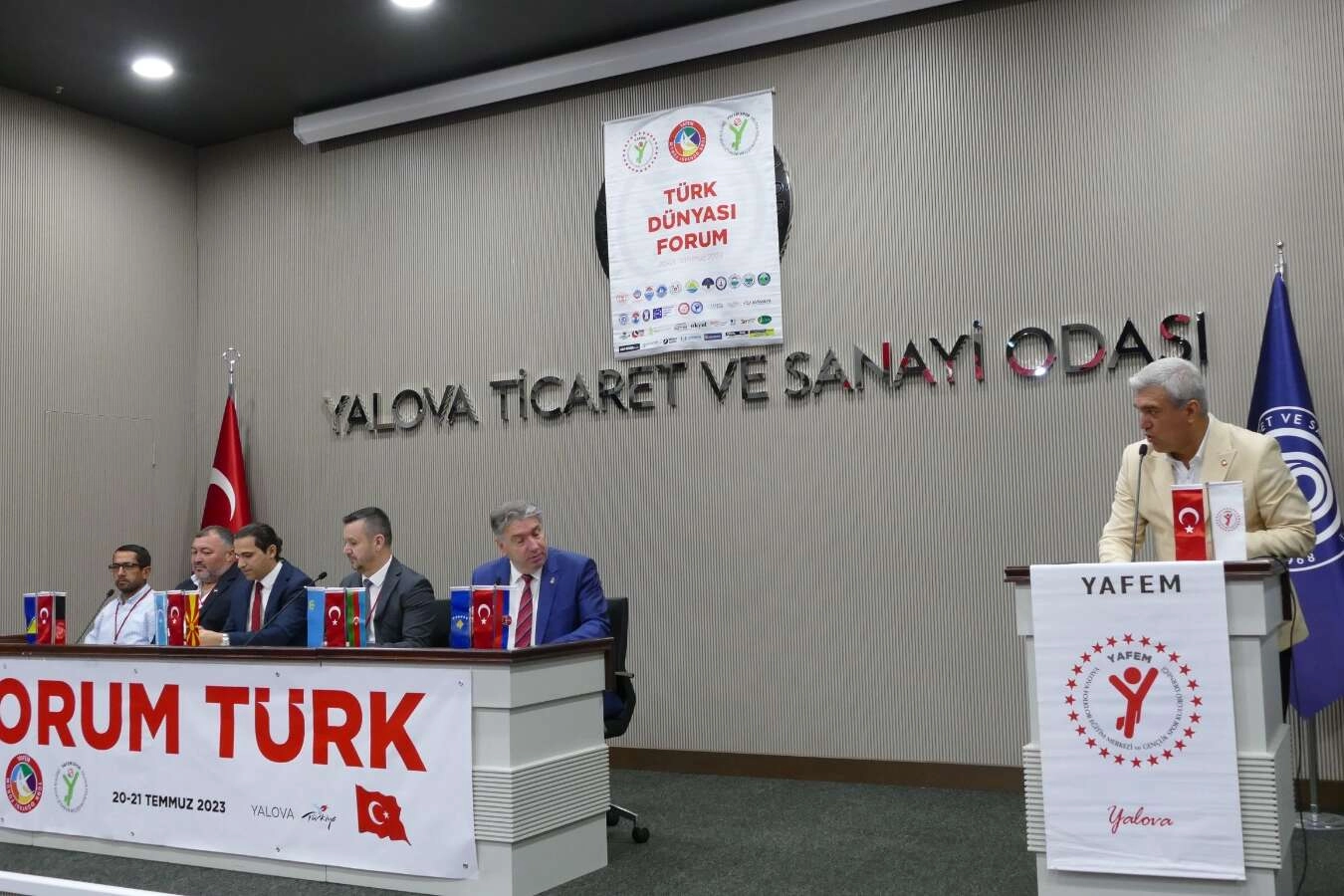 Forumun açılış konuşmasını yapan YAFEM Spor Yönetim Kurulu Başkanı Fikret Kır, toplantının 20- 21 Temmuz 2023 tarihleri arasında 2 gün boyunca süreceğini söyledi. YAFEM olarak 26 yıldır Türk Dünyası ile ilgili faaliyet yürüttüklerini belirten Kır, "Faaliyetlerimizde sadece halk dansları ve folklor gösterisi olarak bakmıyoruz. Bunun dışındaki sosyal ve kültürel etkinlikleri de içerisine katmaya çalıştık. Türk Dünyası, Adriyatik'ten Çin Seddi'ne kadar ulaşan büyük bir coğrafya. Aramıza sınırlar çizdiler. Başka başka ülke isimleri ile anılabiliriz. Ancak kalplerimize sınır çizemezler. Aramızda oluşan dostluğa sınır çizemezler. Bu coğrafyada yaşan Türk ve akraba toplulukları olarak birbirimizle olan kültür bağlarımızı, sosyal ilişkilerimizi, dostluklarımızı koparmadığımız sürece çok büyük bir aile olarak yaşamaya devam edeceğiz. Aynı evin içerisinde olmasak bile biz bir aileyiz. Bu yüzden forumumuzu dilde, fikirde ve işte iş birliği ana teması üzerine kurduk. Türk dünyasında her alanda iş birliğinin oluşmasını arzu ediyoruz" dedi.