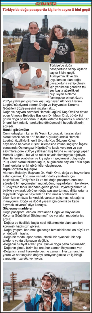 Türkiye’de doğa pasaportuna sahip kişilerin sayısı 8 bini geçti. Türkiye’nin ilk ve tek uygulaması olan doğa pasaportuna sahip olmak için yapılması gereken tek şey başta güzellikleri büyüleyen binlerce flamingolar olmak üzere 250’ye yaklaşan göçmen kuşu ağırlayan Altınova Hersek Lagünü’nü ziyaret ederek Doğa ve Hayvanları Koruma Gönülleri Sözleşmesi’ni imzalamak… Doğa ve hayvan severleri Hersek Lagünü Kuş Oteli’ne davet eden Altınova Belediye Başkanı Dr. Metin Oral, büyük ilgi gören doğa pasaportunun dijital ortama taşınarak sürdürebilir önemli farkındalık hareketine dönüşmesini hedeflediklerini söyledi. Renkli görüntüler Cumhurbaşkanı kararı ile ‘kesin korunacak hassas alan’ olarak tescil edilen 152 hektar büyüklüğündeki Hersek Lagünü, özellikle Engelli Uyumlu Kuş Gözlem Kulesi sayesinde herkesin kuşları izlemesine imkân sağlıyor. İnşası esnasında Osmangazi Köprüsü'ne kavis verdiren ve son sayımlara göre 250’ye yaklaşan kuş türüne ev sahipliği yapan Hersek Lagünü, bu yıl da rekor sayıda flamingoyu ağırlıyor. Bazı türlerin sonbahar ve kış aylarını geçirmesi dolayısıyla ‘Kuş Oteli’ olarak bilinen lagün, bugünlerde sayıları 1500 aşan flamingolarla renkli görüntüler oluşturuyor. Dijital ortama taşınıyor Altınova Belediye Başkanı Dr. Metin Oral, doğa ve hayvanlara sahip çıkmak, korumak ve farkındalık yaratmak için başlattıkları Türkiye’nin ilk ve tek doğa pasaportunun kısa sürede 8 bin geçmesinin mutluluğunu yaşadıklarını belirterek, “Türkiye’nin farklı illerinden gelen gönüllü ziyaretçilerimiz ile birlikte yayılarak büyüyen doğa pasaportumuzu dijital ortama taşıyarak doğa ve hayvanların korunması noktasında ülkemizin en fazla farkındalık yaratan çalışması olacağına inanıyorum. Doğa ve doğal yaşam için önemli bir katkı koymak istiyoruz” diye konuştu. Sözleşme maddeleri Doğa pasaportu alırken imzalanan Doğa ve Hayvanları Koruma Gönüllüleri Sözleşmesi’nde yer alan maddeler ise şöyle; -Doğayı ve özellikle başta nesli tükenmekte olan canlıları korumak hepimizin görevi. -Doğal yaşamı korumak geleceğe bırakılabilecek en büyük ve en değerli mirastır. -Doğa bir moda, spor araba, plastik bir oyuncak, bir cep telefonu ya da bilgisayar değildir. -Doğanın bir fiyat etiketi yok. Çünkü doğa paha biçilmezdir. -Doğanın şimdi, bizim ise ona her zaman ihtiyacımız var. -Doğa için şimdi harekete geçme zamanı. Her zaman, her yerde ve her koşulda doğayı koruyacağımıza ve iş birliği yapacağımıza söz veriyoruz.