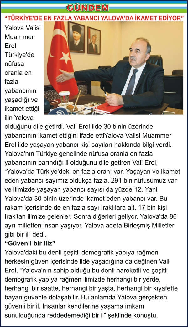 Yalova Valisi Muammer Erol Türkiye’de nüfusa oranla en fazla yabancının yaşadığı ve ikamet ettiği ilin Yalova olduğunu dile getirdi. Vali Erol ilde 30 binin üzerinde yabancının ikamet ettiğini ifade ettiYalova Valisi Muammer Erol ilde yaşayan yabancı kişi sayıları hakkında bilgi verdi. Yalova’nın Türkiye genelinde nüfusa oranla en fazla yabancının barındığı il olduğunu dile getiren Vali Erol, “Yalova’da Türkiye’deki en fazla oranı var. Yaşayan ve ikamet eden yabancı sayımız oldukça fazla. 291 bin nüfusumuz var ve ilimizde yaşayan yabancı sayısı da yüzde 12. Yani Yalova’da 30 binin üzerinde ikamet eden yabancı var. Bu rakam içerisinde de en fazla sayı Iraklılara ait. 17 bin kişi Irak’tan ilimize gelenler. Sonra diğerleri geliyor. Yalova’da 86 ayrı milletten insan yaşıyor. Yalova adeta Birleşmiş Milletler gibi bir il” dedi.