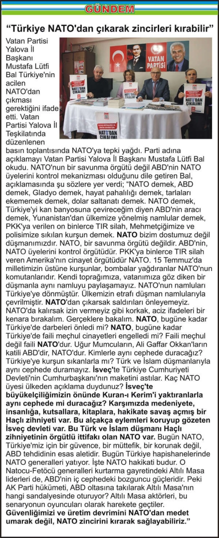 Vatan Partisi Yalova İl Başkanı Mustafa Lütfi Bal Türkiye’nin acilen NATO’dan çıkması gerektiğini ifade etti. Vatan Partisi Yalova İl Teşkilatında düzenlenen basın toplantısında NATO’ya tepki yağdı. Parti adına açıklamayı Vatan Partisi Yalova İl Başkanı Mustafa Lütfi Bal okudu. NATO’nun bir savunma örgütü değil ABD’nin NATO üyelerini kontrol mekanizması olduğunu dile getiren Bal, açıklamasında şu sözlere yer verdi; “NATO demek, ABD demek, Gladyo demek, hayat pahalılığı demek, tarlaları ekememek demek, dolar saltanatı demek. NATO demek, Türkiye’yi kan banyosuna çevireceğim diyen ABD’nin aracı demek, Yunanistan’dan ülkemize yönelmiş namlular demek, PKK’ya verilen on binlerce TIR silah, Mehmetçiğimize ve polisimize sıkılan kurşun demek. NATO bizim dostumuz değil düşmanımızdır. NATO, bir savunma örgütü değildir. ABD'nin, NATO üyelerini kontrol örgütüdür. PKK'ya binlerce TIR silah veren Amerika'nın cinayet örgütüdür NATO. 15 Temmuz'da milletimizin üstüne kurşunlar, bombalar yağdıranlar NATO'nun komutanlarıdır. Kendi toprağımıza, vatanımıza göz diken bir düşmanla aynı namluyu paylaşamayız. NATO'nun namluları Türkiye'ye dönmüştür. Ülkemizin etrafı düşman namlularıyla çevrilmiştir. NATO'dan çıkarsak saldırıları önleyemeyiz. NATO'da kalırsak izin vermeyiz gibi korkak, aciz ifadeleri bir kenara bırakalım. Gerçeklere bakalım. NATO, bugüne kadar Türkiye'de darbeleri önledi mi? NATO, bugüne kadar Türkiye'de faili meçhul cinayetleri engelledi mi? Faili meçhul değil faili NATO'dur. Uğur Mumcuların, Ali Gaffar Okkan'ların katili ABD'dir, NATO'dur. Kimlerle aynı cephede duracağız? Türkiye'ye kurşun sıkanlarla mı? Türk ve İslam düşmanlarıyla aynı cephede duramayız. İsveç'te Türkiye Cumhuriyeti Devleti’nin Cumhurbaşkanı'nın maketini astılar. Kaç NATO üyesi ülkeden açıklama duydunuz? İsveç'te büyükelçiliğimizin önünde Kuran-ı Kerim'i yaktıranlarla aynı cephede mi duracağız? Karşımızda medeniyete, insanlığa, kutsallara, kitaplara, hakikate savaş açmış bir Haçlı zihniyeti var. Bu alçakça eylemleri koruyup gözeten İsveç devleti var. Bu Türk ve İslam düşmanı Haçlı zihniyetinin örgütlü ittifakı olan NATO var. Bugün NATO, Türkiye’miz için bir güvence, bir müttefik, bir korunak değil, ABD tehdidinin esas aletidir. Bugün Türkiye hapishanelerinde NATO generalleri yatıyor. İşte NATO hakikati budur. O Natocu-Fetöcü generalleri kurtarma gayretindeki Altılı Masa liderleri de, ABD'nin iç cephedeki bozguncu güçleridir. Peki AK Parti hükümeti, ABD oltasına takılarak Altılı Masa'nın hangi sandalyesinde oturuyor? Altılı Masa aktörleri, bu senaryonun oyuncuları olarak harekete geçtiler. Güvenliğimizi ve üretim devrimini NATO'dan medet umarak değil, NATO zincirini kırarak sağlayabiliriz.”