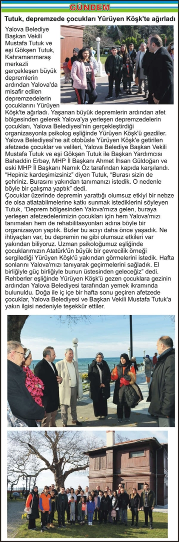 Yalova Belediye Başkan Vekili Mustafa Tutuk ve eşi Gökşen Tutuk, Kahramanmaraş merkezli gerçekleşen büyük depremlerin ardından Yalova’da misafir edilen depremzedelerin çocuklarını Yürüyen Köşk’te ağırladı. Yaşanan büyük depremlerin ardından afet bölgesinden gelerek Yalova’ya yerleşen depremzedelerin çocukları, Yalova Belediyesi’nin gerçekleştirdiği organizasyonla psikolog eşliğinde Yürüyen Köşk’ü gezdiler. Yalova Belediyesi’ne ait otobüsle Yürüyen Köşk’e getirilen afetzede çocuklar ve velileri, Yalova Belediye Başkan Vekili Mustafa Tutuk ve eşi Gökşen Tutuk ile Başkan Yardımcısı Bahaddin Erbay, MHP İl Başkanı Ahmet İhsan Güldoğan ve eski MHP İl Başkanı Namık Öz tarafından kapıda karşılandı. “Hepiniz kardeşimizsiniz” diyen Tutuk, “Burası sizin de şehriniz. Burasını yakından tanımanızı istedik. O nedenle böyle bir çalışma yaptık” dedi. Çocuklar üzerinde depremin yarattığı olumsuz etkiyi bir nebze de olsa atlatabilmelerine katkı sunmak istediklerini söyleyen Tutuk, “Deprem bölgesinden Yalova’mıza gelen, buraya yerleşen afetzedelerimizin çocukları için hem Yalova’mızı tanımaları hem de rehabilitasyonları adına böyle bir organizasyon yaptık. Bizler bu acıyı daha önce yaşadık. Ne ihtiyaçları var, bu depremin ne gibi olumsuz etkileri var yakından biliyoruz. Uzman psikoloğumuz eşliğinde çocuklarımızın Atatürk’ün büyük bir çevrecilik örneği sergilediği Yürüyen Köşk’ü yakından görmelerini istedik. Hafta sonlarını Yalova’mızı tanıyarak geçirmelerini sağladık. El birliğiyle güç birliğiyle bunun üstesinden geleceğiz” dedi. Rehberler eşliğinde Yürüyen Köşk’ü gezen çocuklara gezinin ardından Yalova Belediyesi tarafından yemek ikramında bulunuldu. Doğa ile iç içe bir hafta sonu geçiren afetzede çocuklar, Yalova Belediyesi ve Başkan Vekili Mustafa Tutuk’a yakın ilgisi nedeniyle teşekkür ettiler.