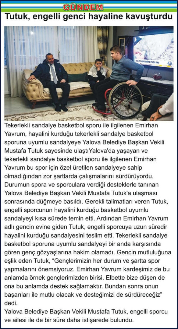 Tekerlekli sandalye basketbol sporu ile ilgilenen Emirhan Yavrum, hayalini kurduğu tekerlekli sandalye basketbol sporuna uyumlu sandalyeye Yalova Belediye Başkan Vekili Mustafa Tutuk sayesinde ulaştıYalova’da yaşayan ve tekerlekli sandalye basketbol sporu ile ilgilenen Emirhan Yavrum bu spor için özel üretilen sandalyeye sahip olmadığından zor şartlarda çalışmalarını sürdürüyordu. Durumun spora ve sporculara verdiği desteklerle tanınan Yalova Belediye Başkan Vekili Mustafa Tutuk’a ulaşması sonrasında düğmeye basıldı. Gerekli talimatları veren Tutuk, engelli sporcunun hayalini kurduğu basketbol uyumlu sandalyeyi kısa sürede temin etti. Ardından Emirhan Yavrum adlı gencin evine giden Tutuk, engelli sporcuya uzun süredir hayalini kurduğu sandalyesini teslim etti. Tekerlekli sandalye basketbol sporuna uyumlu sandalyeyi bir anda karşısında gören genç gözyaşlarına hakim olamadı. Gencin mutluluğuna eşlik eden Tutuk, “Gençlerimizin her durum ve şartta spor yapmalarını önemsiyoruz. Emirhan Yavrum kardeşimiz de bu anlamda örnek gençlerimizden birisi. Elbette bize düşen de ona bu anlamda destek sağlamaktır. Bundan sonra onun başarıları ile mutlu olacak ve desteğimizi de sürdüreceğiz” dedi. Yalova Belediye Başkan Vekili Mustafa Tutuk, engelli sporcu ve ailesi ile de bir süre daha istişarede bulundu.