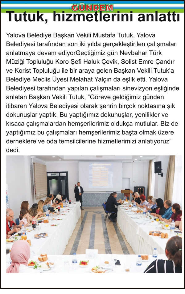 Yalova Belediye Başkan Vekili Mustafa Tutuk, Yalova Belediyesi tarafından son iki yılda gerçekleştirilen çalışmaları anlatmaya devam ediyorGeçtiğimiz gün Nevbahar Türk Müziği Topluluğu Koro Şefi Haluk Çevik, Solist Emre Çandır ve Korist Topluluğu ile bir araya gelen Başkan Vekili Tutuk’a Belediye Meclis Üyesi Melahat Yalçın da eşlik etti. Yalova Belediyesi tarafından yapılan çalışmaları sinevizyon eşliğinde anlatan Başkan Vekili Tutuk, “Göreve geldiğimiz günden itibaren Yalova Belediyesi olarak şehrin birçok noktasına şık dokunuşlar yaptık. Bu yaptığımız dokunuşlar, yenilikler ve kısaca çalışmalardan hemşerilerimiz oldukça mutlular. Biz de yaptığımız bu çalışmaları hemşerilerimiz başta olmak üzere derneklere ve oda temsilcilerine hizmetlerimizi anlatıyoruz” dedi.