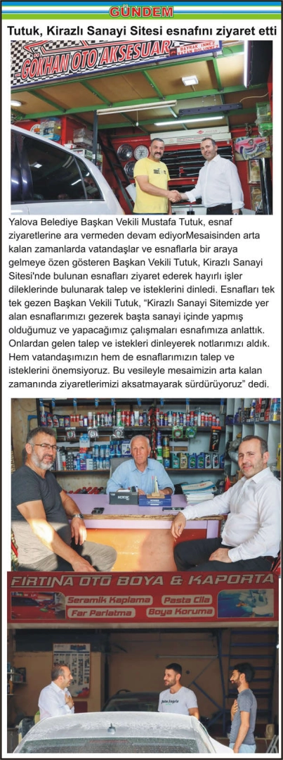 Yalova Belediye Başkan Vekili Mustafa Tutuk, esnaf ziyaretlerine ara vermeden devam ediyorMesaisinden arta kalan zamanlarda vatandaşlar ve esnaflarla bir araya gelmeye özen gösteren Başkan Vekili Tutuk, Kirazlı Sanayi Sitesi’nde bulunan esnafları ziyaret ederek hayırlı işler dileklerinde bulunarak talep ve isteklerini dinledi. Esnafları tek tek gezen Başkan Vekili Tutuk, “Kirazlı Sanayi Sitemizde yer alan esnaflarımızı gezerek başta sanayi içinde yapmış olduğumuz ve yapacağımız çalışmaları esnafımıza anlattık. Onlardan gelen talep ve istekleri dinleyerek notlarımızı aldık. Hem vatandaşımızın hem de esnaflarımızın talep ve isteklerini önemsiyoruz. Bu vesileyle mesaimizin arta kalan zamanında ziyaretlerimizi aksatmayarak sürdürüyoruz” dedi.