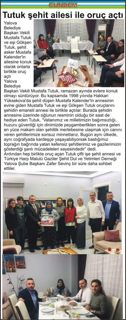 Yalova Belediye Başkan Vekili Mustafa Tutuk ve eşi Gökşen Tutuk, şehit asker Mustafa Kalender’in ailesine konuk olarak onlarla birlikte oruç açtı