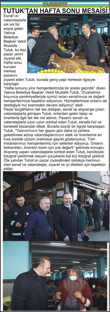Esnaf ve vatandaşlarla sık sık bir araya gelen Yalova Belediye Başkan Vekili Mustafa Tutuk, bu kez pazar yerini ziyaret etti. Hafta sonu kurulan merkez pazarını ziyaret eden Tutuk, burada genç-yaşlı herkesin ilgisiyle karşılaştı