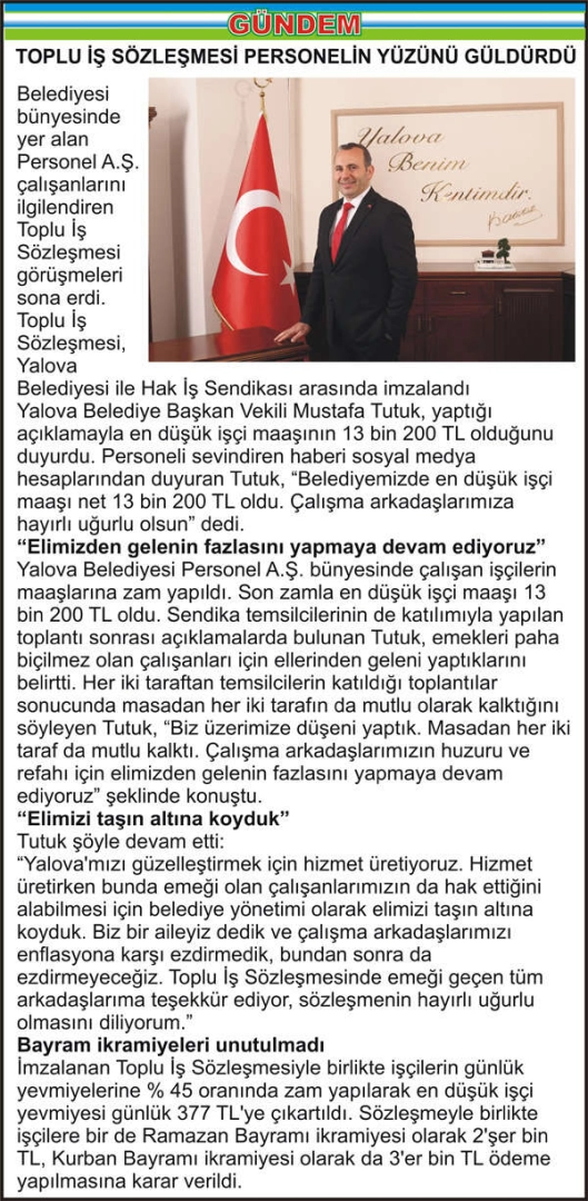 Yalova Belediye Başkan Vekili Mustafa Tutuk Yalova Belediyesi’ndeki en düşük maaşın 13 bin 200 TL olduğunu açıkladı. Tutuk, Ramazan ve Kurban Bayramlarında da ikramiye verileceği müjdesini paylaştı