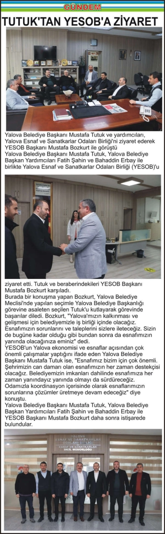 Yalova Belediye Başkanı Mustafa Tutuk ve yardımcıları, Yalova Esnaf ve Sanatkarlar Odaları Birliği'ni ziyaret ederek YESOB Başkanı Mustafa Bozkurt ile görüştü Yalova Belediye Başkanı Mustafa Tutuk, Yalova Belediye Başkan Yardımcıları Fatih Şahin ve Bahaddin Erbay ile birlikte Yalova Esnaf ve Sanatkarlar Odaları Birliği (YESOB)'u ziyaret etti. Tutuk ve beraberindekileri YESOB Başkanı Mustafa Bozkurt karşıladı. Burada bir konuşma yapan Bozkurt, Yalova Belediye Meclisi'nde yapılan seçimle Yalova Belediye Başkanlığı görevine asaleten seçilen Tutuk'u kutlayarak görevinde başarılar diledi. Bozkurt, "Yalova'mızın kalkınması ve gelişmesi için belediyemizle iş birliği içinde olacağız. Esnafımızın sorunlarını ve taleplerini sizlere ileteceğiz. Sizin de bugüne kadar olduğu gibi bundan sonra da esnafımızın yanında olacağınıza eminiz" dedi. YESOB’un Yalova ekonomisi ve esnaflar açısından çok önemli çalışmalar yaptığını ifade eden Yalova Belediye Başkanı Mustafa Tutuk ise, "Esnafımız bizim için çok önemli. Şehrimizin can damarı olan esnafımızın her zaman destekçisi olacağız. Belediyemizin imkanları dahilinde esnafımıza her zaman yanındayız yanında olmayı da sürdüreceğiz. Odamızla koordinasyon içerisinde olarak esnaflarımızın sorunlarına çözümler üretmeye devam edeceğiz" diye konuştu. Yalova Belediye Başkanı Mustafa Tutuk, Yalova Belediye Başkan Yardımcıları Fatih Şahin ve Bahaddin Erbay ile YESOB Başkanı Mustafa Bozkurt daha sonra istişarede bulundular.
