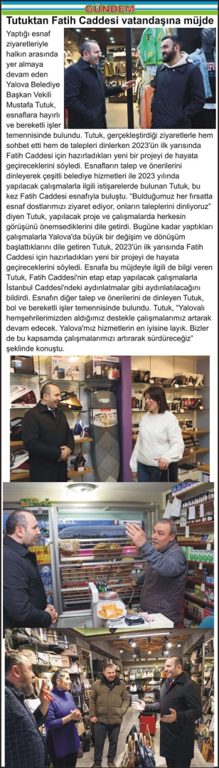 Yaptığı esnaf ziyaretleriyle halkın arasında yer almaya devam eden Yalova Belediye Başkan Vekili Mustafa Tutuk, esnaflara hayırlı ve bereketli işler temennisinde bulundu. Tutuk, gerçekleştirdiği ziyaretlerle hem sohbet etti hem de talepleri dinlerken 2023’ün ilk yarısında Fatih Caddesi için hazırladıkları yeni bir projeyi de hayata geçireceklerini söyledi. Esnafların talep ve önerilerini dinleyerek çeşitli belediye hizmetleri ile 2023 yılında yapılacak çalışmalarla ilgili istişarelerde bulunan Tutuk, bu kez Fatih Caddesi esnafıyla buluştu. “Bulduğumuz her fırsatta esnaf dostlarımızı ziyaret ediyor, onların taleplerini dinliyoruz” diyen Tutuk, yapılacak proje ve çalışmalarda herkesin görüşünü önemsediklerini dile getirdi. Bugüne kadar yaptıkları çalışmalarla Yalova’da büyük bir değişim ve dönüşüm başlattıklarını dile getiren Tutuk, 2023’ün ilk yarısında Fatih Caddesi için hazırladıkları yeni bir projeyi de hayata geçireceklerini söyledi. Esnafa bu müjdeyle ilgili de bilgi veren Tutuk, Fatih Caddesi’nin etap etap yapılacak çalışmalarla İstanbul Caddesi’ndeki aydınlatmalar gibi aydınlatılacağını bildirdi. Esnafın diğer talep ve önerilerini de dinleyen Tutuk, bol ve bereketli işler temennisinde bulundu. Tutuk, “Yalovalı hemşehrilerimizden aldığımız destekle çalışmalarımız artarak devam edecek. Yalova’mız hizmetlerin en iyisine layık. Bizler de bu kapsamda çalışmalarımızı artırarak sürdüreceğiz” şeklinde konuştu.