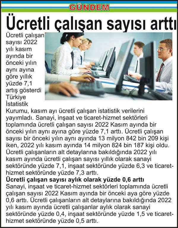 Ücretli çalışan sayısı 2022 yılı kasım ayında bir önceki yılın aynı ayına göre yıllık yüzde 7,1 artış gösterdi Türkiye İstatistik Kurumu, kasım ayı ücretli çalışan istatistik verilerini yayımladı. Sanayi, inşaat ve ticaret-hizmet sektörleri toplamında ücretli çalışan sayısı 2022 Kasım ayında bir önceki yılın aynı ayına göre yüzde 7,1 arttı. Ücretli çalışan sayısı bir önceki yılın aynı ayında 13 milyon 842 bin 209 kişi iken, 2022 yılı kasım ayında 14 milyon 824 bin 187 kişi oldu. Ücretli çalışanların alt detaylarına bakıldığında 2022 yılı kasım ayında ücretli çalışan sayısı yıllık olarak sanayi sektöründe yüzde 7,1, inşaat sektöründe yüzde 6,3 ve ticaret-hizmet sektöründe yüzde 7,3 arttı. Ücretli çalışan sayısı aylık olarak yüzde 0,6 arttı Sanayi, inşaat ve ticaret-hizmet sektörleri toplamında ücretli çalışan sayısı 2022 Kasım ayında bir önceki aya göre yüzde 0,6 arttı. Ücretli çalışanların alt detaylarına bakıldığında 2022 yılı kasım ayında ücretli çalışanlar aylık olarak sanayi sektöründe yüzde 0,4, inşaat sektöründe yüzde 1,5 ve ticaret-hizmet sektöründe yüzde 0,5 arttı.