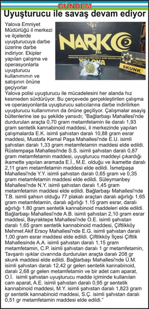 Yalova Emniyet Müdürlüğü il merkezi ve ilçelerde uyuşturucuya darbe üzerine darbe indiriyor. Ekipler yapılan çalışma ve operasyonlarla uyuşturucu kullanımının ve satışının önüne geçiyorlar Yalova polisi uyuşturucu ile mücadelesini her alanda hız kesmeden sürdürüyor. Bu çerçevede gerçekleştirilen çalışma ve operasyonlarda uyuşturucu satıcılarına darbe indirilirken uyuşturucu kullanımının da önüne geçiliyor. Çalışmalar asayiş bültenlerine ise şu şekilde yansıdı; “Bağlarbaşı Mahallesi’nde durdurulan araçta 0,70 gram metamfetamin ile daralı 1,93 gram sentetik kannabinoid maddesi, il merkezinde yapılan çalışmalarda E.K. isimli şahıstan daralı 10,88 gram esrar maddesi, Mustafa Kemal Paşa Mahallesi’nde E.U. isimli şahıstan daralı 1,33 gram metamfetamin maddesi elde edildi. Rüstempaşa Mahallesi!nde S.S. isimli şahıstan daralı 0,87 gram metamfetamin maddesi, uyuşturucu maddeyi çıkardığı ikamette yapılan aramada E.İ., M.E. olduğu ve ikamette daralı 2,11 gram metamfetamin maddesi elde edildi. İsmetpaşa Mahallesi’nde Y.Y. isimli şahıstan daralı 0,65 gram ve 0,35 gram metamfetamin maddesi elde edildi. Süleymanbey Mahallesi’nde N.Y. isimli şahıstan daralı 1,45 gram metamfetamin maddesi elde edildi. Bağlarbaşı Mahallesi’nde T.B. isimli şahsın olduğu 77 plakalı araçtan daralı ağırlığı 1,65 gram metamfetamin, daralı ağırlığı 1.15 gram esrar, daralı ağırlığı 1.80 gram sentetik kannabinoid maddeleri elde edildi. Bağlarbaşı Mahallesi’nde A.B. isimli şahıstan 2,10 gram esrar maddesi, Bayraktepe Mahallesi’nde O.E. isimli şahıstan daralı 1,65 gram sentetik kannabinoid maddesi, Çiftlikköy Mehmet Akif Ersoy Mahallesi’nde E.G. isimli şahıstan daralı 1,00 gram esrar maddesi elde edildi. Çiftlikköy İlçesi Çiftlik Mahallesinde A.A. isimli şahıstan daralı 1,15 gram metamfetamin, C.P. isimli şahıstan daralı 1 gr metamfetamin, Tavşanlı ışıklar civarında durdurulan araçta daralı 208 gr skunk maddesi elde edildi. Bağlarbaşı Mahallesi’nde Ü.M. isimli şahıstan daralı 12,42 gr gelen sentetik kannabinoid, daralı 2,68 gr gelen metamfetamin ve bir adet cam aparat, O.İ. isimli şahıstan uyuşturucu madde içiminde kullanılan cam aparat, A.E. isimli şahıstan daralı 0,95 gr sentetik kannabinoid maddesi, M.Y. isimli şahıstan daralı 1,823 gram gr sentetik kannabinoid maddesi, S.Ç. isimli şahıstan daralı 0,51 gr metamfetamin maddesi elde edildi.”