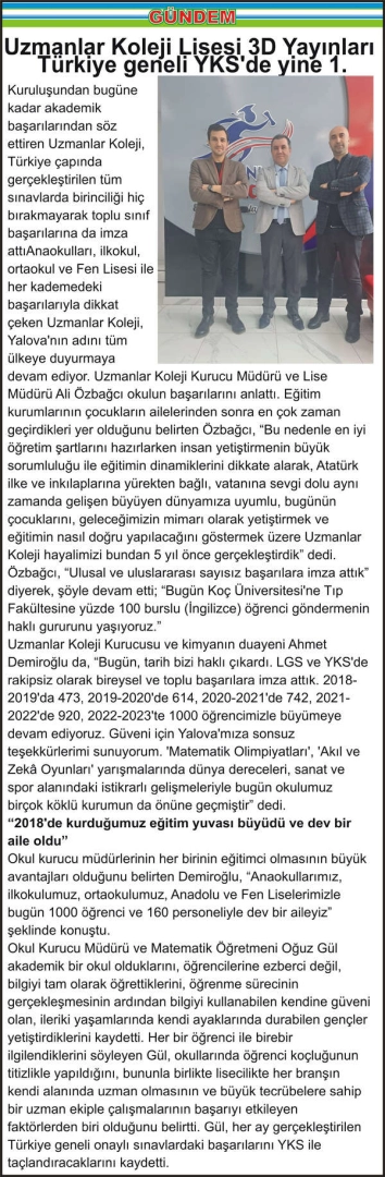 Kuruluşundan bugüne kadar akademik başarılarından söz ettiren Uzmanlar Koleji, Türkiye çapında gerçekleştirilen tüm sınavlarda birinciliği hiç bırakmayarak toplu sınıf başarılarına da imza attıAnaokulları, ilkokul, ortaokul ve Fen Lisesi ile her kademedeki başarılarıyla dikkat çeken Uzmanlar Koleji, Yalova’nın adını tüm ülkeye duyurmaya devam ediyor. Uzmanlar Koleji Kurucu Müdürü ve Lise Müdürü Ali Özbağcı okulun başarılarını anlattı. Eğitim kurumlarının çocukların ailelerinden sonra en çok zaman geçirdikleri yer olduğunu belirten Özbağcı, “Bu nedenle en iyi öğretim şartlarını hazırlarken insan yetiştirmenin büyük sorumluluğu ile eğitimin dinamiklerini dikkate alarak, Atatürk ilke ve inkılaplarına yürekten bağlı, vatanına sevgi dolu aynı zamanda gelişen büyüyen dünyamıza uyumlu, bugünün çocuklarını, geleceğimizin mimarı olarak yetiştirmek ve eğitimin nasıl doğru yapılacağını göstermek üzere Uzmanlar Koleji hayalimizi bundan 5 yıl önce gerçekleştirdik” dedi. Özbağcı, “Ulusal ve uluslararası sayısız başarılara imza attık” diyerek, şöyle devam etti; “Bugün Koç Üniversitesi’ne Tıp Fakültesine yüzde 100 burslu (İngilizce) öğrenci göndermenin haklı gururunu yaşıyoruz.” Uzmanlar Koleji Kurucusu ve kimyanın duayeni Ahmet Demiroğlu da, “Bugün, tarih bizi haklı çıkardı. LGS ve YKS’de rakipsiz olarak bireysel ve toplu başarılara imza attık. 2018-2019’da 473, 2019-2020’de 614, 2020-2021’de 742, 2021-2022’de 920, 2022-2023’te 1000 öğrencimizle büyümeye devam ediyoruz. Güveni için Yalova’mıza sonsuz teşekkürlerimi sunuyorum. ‘Matematik Olimpiyatları’, ‘Akıl ve Zekâ Oyunları’ yarışmalarında dünya dereceleri, sanat ve spor alanındaki istikrarlı gelişmeleriyle bugün okulumuz birçok köklü kurumun da önüne geçmiştir” dedi. “2018’de kurduğumuz eğitim yuvası büyüdü ve dev bir aile oldu” Okul kurucu müdürlerinin her birinin eğitimci olmasının büyük avantajları olduğunu belirten Demiroğlu, “Anaokullarımız, ilkokulumuz, ortaokulumuz, Anadolu ve Fen Liselerimizle bugün 1000 öğrenci ve 160 personeliyle dev bir aileyiz” şeklinde konuştu. Okul Kurucu Müdürü ve Matematik Öğretmeni Oğuz Gül akademik bir okul olduklarını, öğrencilerine ezberci değil, bilgiyi tam olarak öğrettiklerini, öğrenme sürecinin gerçekleşmesinin ardından bilgiyi kullanabilen kendine güveni olan, ileriki yaşamlarında kendi ayaklarında durabilen gençler yetiştirdiklerini kaydetti. Her bir öğrenci ile birebir ilgilendiklerini söyleyen Gül, okullarında öğrenci koçluğunun titizlikle yapıldığını, bununla birlikte lisecilikte her branşın kendi alanında uzman olmasının ve büyük tecrübelere sahip bir uzman ekiple çalışmalarının başarıyı etkileyen faktörlerden biri olduğunu belirtti. Gül, her ay gerçekleştirilen Türkiye geneli onaylı sınavlardaki başarılarını YKS ile taçlandıracaklarını kaydetti.
