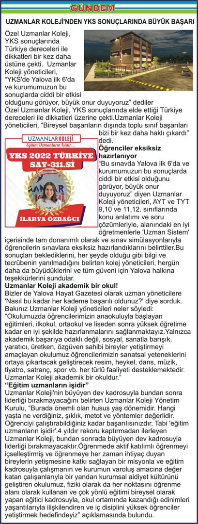 Özel Uzmanlar Koleji, YKS sonuçlarında Türkiye dereceleri ile dikkatleri bir kez daha üstüne çekti. Uzmanlar Koleji yöneticileri, “YKS’de Yalova ilk 6’da ve kurumumuzun bu sonuçlarda ciddi bir etkisi olduğunu görüyor, büyük onur duyuyoruz” dediler Özel Uzmanlar Koleji, YKS sonuçlarında elde ettiği Türkiye dereceleri ile dikkatleri üzerine çekti.Uzmanlar Koleji yöneticileri, “Bireysel başarıların dışında toplu sınıf başarıları bizi bir kez daha haklı çıkardı” dedi. Öğrenciler eksiksiz hazırlanıyor “Bu sınavda Yalova ilk 6’da ve kurumumuzun bu sonuçlarda ciddi bir etkisi olduğunu görüyor, büyük onur duyuyoruz” diyen Uzmanlar Koleji yöneticileri, AYT ve TYT 9,10 ve 11,12. sınıflarında konu anlatımı ve soru çözümleriyle, alanındaki en iyi öğretmenlerle ‘Uzman Sistem’ içerisinde tam donanımlı olarak ve sınav simülasyonlarıyla öğrencilerin sınavlara eksiksiz hazırlandıklarını belirttiler.Bu sonuçları beklediklerini, her şeyde olduğu gibi bilgi ve tecrübenin yanılmadığını belirten kolej yöneticileri, hergün daha da büyüdüklerini ve tüm güveni için Yalova halkına teşekkürlerini sundular. Uzmanlar Koleji akademik bir okul! Bizler de Yalova Hayat Gazetesi olarak uzman yöneticilere ‘Nasıl bu kadar her kademe başarılı oldunuz?’ diye sorduk. Bakınız Uzmanlar Koleji yöneticileri neler söyledi: “Okulumuzda öğrencilerimizin anaokuluyla başlayan eğitimleri, ilkokul, ortaokul ve liseden sonra yüksek öğretime kadar en iyi şekilde hazırlanmalarını sağlanmaktayız.Yalnızca akademik başarıya odaklı değil, sosyal, sanatla barışık, yaratıcı, üretken, özgüven sahibi bireyler yetiştirmeyi amaçlayan okulumuz öğrencilerimizin sanatsal yeteneklerini ortaya çıkartacak geliştirecek resim, heykel, dans, müzik, tiyatro, satranç, spor vb. her türlü faaliyeti desteklemektedir. Uzmanlar Koleji akademik bir okuldur.” “Eğitim uzmanların işidir” Uzmanlar Koleji’nin büyüyen dev kadrosuyla bundan sonra liderliği bırakmayacağını belirten Uzmanlar Koleji Yönetim Kurulu, “Burada önemli olan husus yaş dönemidir. Hangi yaşta ne verdiğiniz, şıklık, metot ve yöntemler değerlidir. Öğrenciyi çalıştırabildiğiniz kadar başarılısınızdır. Tabi ‘eğitim uzmanların işidir’.4 yıldır rekoru kaptırmadan ilerleyen Uzmanlar Koleji, bundan sonrada büyüyen dev kadrosuyla liderliği bırakmayacaktır.Öğrenmede aktif katılımlı öğrenmeyi içselleştirmiş ve öğrenmeye her zaman ihtiyaç duyan bireylerin yetişmesine katkı sağlayan bir misyonla ve eğitim kadrosuyla çalışmanın ve kurumun varoluş amacına değer katan çalışanlarıyla bir yandan kurumsal aidiyet kültürünü geliştiren okulumuz, fiziki olarak da her noktasını öğrenme alanı olarak kullanan ve çok yönlü eğitimi bireysel olarak yapan eğitici kadrosuyla, okul ortamında kazandığı edinimleri yaşantılarıyla ilişkilendiren ve iç disiplini yüksek öğrenciler yetiştirmek hedefindeyiz” açıklamasında bulundu.