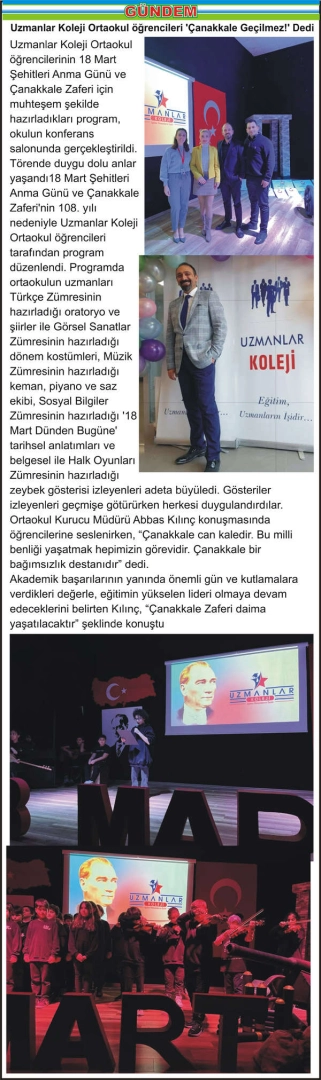 Uzmanlar Koleji Ortaokul öğrencilerinin 18 Mart Şehitleri Anma Günü ve Çanakkale Zaferi için muhteşem şekilde hazırladıkları program, okulun konferans salonunda gerçekleştirildi. Törende duygu dolu anlar yaşandı18 Mart Şehitleri Anma Günü ve Çanakkale Zaferi’nin 108. yılı nedeniyle Uzmanlar Koleji Ortaokul öğrencileri tarafından program düzenlendi. Programda ortaokulun uzmanları Türkçe Zümresinin hazırladığı oratoryo ve şiirler ile Görsel Sanatlar Zümresinin hazırladığı dönem kostümleri, Müzik Zümresinin hazırladığı keman, piyano ve saz ekibi, Sosyal Bilgiler Zümresinin hazırladığı ‘18 Mart Dünden Bugüne’ tarihsel anlatımları ve belgesel ile Halk Oyunları Zümresinin hazırladığı zeybek gösterisi izleyenleri adeta büyüledi. Gösteriler izleyenleri geçmişe götürürken herkesi duygulandırdılar. Ortaokul Kurucu Müdürü Abbas Kılınç konuşmasında öğrencilerine seslenirken, “Çanakkale can kaledir. Bu milli benliği yaşatmak hepimizin görevidir. Çanakkale bir bağımsızlık destanıdır” dedi. Akademik başarılarının yanında önemli gün ve kutlamalara verdikleri değerle, eğitimin yükselen lideri olmaya devam edeceklerini belirten Kılınç, “Çanakkale Zaferi daima yaşatılacaktır” şeklinde konuştu