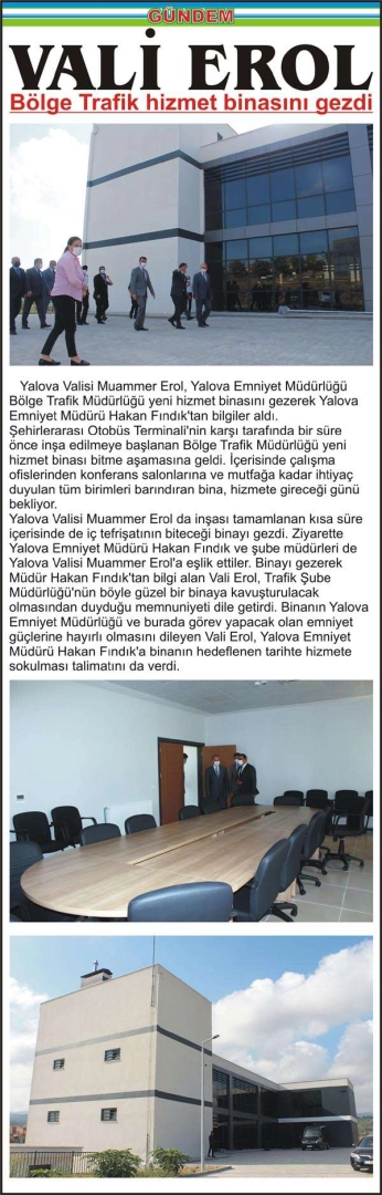 Vali Erol, Bölge Trafik hizmet binasını gezdi Yalova Valisi Muammer Erol, Yalova Emniyet Müdürlüğü Bölge Trafik Müdürlüğü yeni hizmet binasını gezerek Yalova Emniyet Müdürü Hakan Fındık’tan bilgiler aldı. Şehirlerarası Otobüs Terminali’nin karşı tarafında bir süre önce inşa edilmeye başlanan Bölge Trafik Müdürlüğü yeni hizmet binası bitme aşamasına geldi. İçerisinde çalışma ofislerinden konferans salonlarına ve mutfağa kadar ihtiyaç duyulan tüm birimleri barındıran bina, hizmete gireceği günü bekliyor. Yalova Valisi Muammer Erol da inşası tamamlanan kısa süre içerisinde de iç tefrişatının biteceği binayı gezdi. Ziyarette Yalova Emniyet Müdürü Hakan Fındık ve şube müdürleri de Yalova Valisi Muammer Erol’a eşlik ettiler. Binayı gezerek Müdür Hakan Fındık’tan bilgi alan Vali Erol, Trafik Şube Müdürlüğü’nün böyle güzel bir binaya kavuşturulacak olmasından duyduğu memnuniyeti dile getirdi. Binanın Yalova Emniyet Müdürlüğü ve burada görev yapacak olan emniyet güçlerine hayırlı olmasını dileyen Vali Erol, Yalova Emniyet Müdürü Hakan Fındık’a binanın hedeflenen tarihte hizmete sokulması talimatını da verdi.