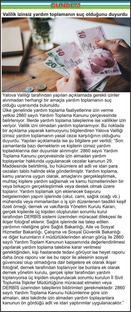 Yalova Valiliği tarafından yapılan açıklamada gerekli izinler alınmadan herhangi bir amaçla yardım toplamanın suç olduğu uyarısında bulunuldu Ülke genelinde yardım toplama faaliyetlerine izin verme yetkisi 2860 sayılı Yardım Toplama Kanunu çerçevesinde belirleniyor. İllerde yardım toplama taleplerine ise valilikler izin veriyor. Valilik izni olmadan yardım toplanamıyor. Bu noktada bir açıklama yaparak kamuoyunu bilgilendiren Yalova Valiliği izinsiz yardım toplamanın yasal cezai karşılığının olduğunu duyurdu. Yapılan açıklamada ise şu bilgilere yer verildi; “Son zamanlarda bazı derneklerin ve kişilerin izinsiz yardım topladıklarına dair duyumlar alınmıştır. 2860 sayılı Yardım Toplama Kanunu çerçevesinde izin almadan yardım toplayanlar hakkında uygulanacak cezalar kanunun 29. Maddesinde belirtilmiş, bu hükümlere ait adli ve idari para cezaları tablo halinde ekte gönderilmiştir. Yardım toplama, kamu yararına uygun olarak, amaçlarını gerçekleştirmek, muhtaç kişilere yardım sağlamak ve kamu hizmetlerinden bir veya birkaçını gerçekleştirmek veya destek olmak üzere toplanır. Yardım toplamak için eklenecek başvuru belgelerinden yapım işlerinde (okul, cami, sağlık ocağı vb.) mühendis veya mimarlardan o iş için düzenlenen tasdikli keşif özeti örneği, dernek ve vakıflarda Yönetim Kurulu Kararı, gerçek kişilerde üç kişiden oluşturulan sorumlu kurul tarafından DERBİS sistemi üzerinden müracaat dilekçesi ile ikişer fotoğraf eklenir. Sağlık işlerinde ise talep edilen yardımın niteliğine göre Sağlık Bakanlığı, Aile ve Sosyal Hizmetler Bakanlığı, Çalışma ve Sosyal Güvenlik Bakanlığı ve diğer kurumların il müdürlüklerinden alınan görüş ile 2860 sayılı Yardım Toplam Kanunun kapsamında değerlendirilmesi yapılarak yardım toplama talebine karar verilmesi gerektiğinden, kişi hastanede tedavi görüyor ise heyet raporu daha önce raporu var ise bu rapor ile ailesinin sosyal güvencesi olup olmadığına dair belgelere ek olarak ikişer fotoğraf, dernek tarafından toplanıyor ise bunlara ek olarak dernek yönetim kurulu, gerçek işiler tarafından yardım toplanıyorsa üç kişiden oluşturulacak sorumlu kurulun İl Sivil Toplumla İlişkiler Müdürlüğüne müracaat etmeleri veya DERBİS üzerinden taleplerini bildirimleri gerekmektedir. 2860 sayılı Yardım Toplama Kanunu hükümlerine göre izin almaları, aksi takdirde izin almadan yardım toplayanlara kanunun ön gördüğü adli ve idari yaptırımlar uygulanacaktır.”