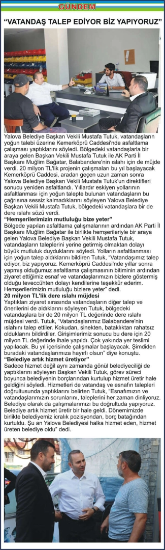 Yalova Belediye Başkan Vekili Mustafa Tutuk, vatandaşların yoğun talebi üzerine Kemerköprü Caddesi’nde asfaltlama çalışması yaptıklarını söyledi. Bölgedeki vatandaşlarla bir araya gelen Başkan Vekili Mustafa Tutuk ile AK Parti İl Başkanı Muğlim Bağatar, Balabandere’nin ıslahı için de müjde verdi. 20 milyon TL’lik projenin çalışmaları bu yıl başlayacak