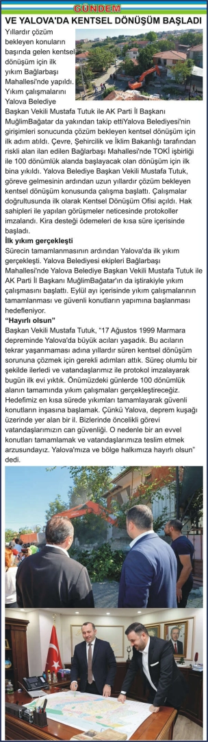 Yıllardır çözüm bekleyen konuların başında gelen kentsel dönüşüm için ilk yıkım Bağlarbaşı Mahallesi’nde yapıldı. Yıkım çalışmalarını Yalova Belediye Başkan Vekili Mustafa Tutuk ile AK Parti İl Başkanı MuğlimBağatar da yakından takip ettiYalova Belediyesi’nin girişimleri sonucunda çözüm bekleyen kentsel dönüşüm için ilk adım atıldı. Çevre, Şehircilik ve İklim Bakanlığı tarafından riskli alan ilan edilen Bağlarbaşı Mahallesi’nde TOKİ işbirliği ile 100 dönümlük alanda başlayacak olan dönüşüm için ilk bina yıkıldı. Yalova Belediye Başkan Vekili Mustafa Tutuk, göreve gelmesinin ardından uzun yıllardır çözüm bekleyen kentsel dönüşüm konusunda çalışma başlattı. Çalışmalar doğrultusunda ilk olarak Kentsel Dönüşüm Ofisi açıldı. Hak sahipleri ile yapılan görüşmeler neticesinde protokoller imzalandı. Kira desteği ödemeleri de kısa süre içerisinde başladı.