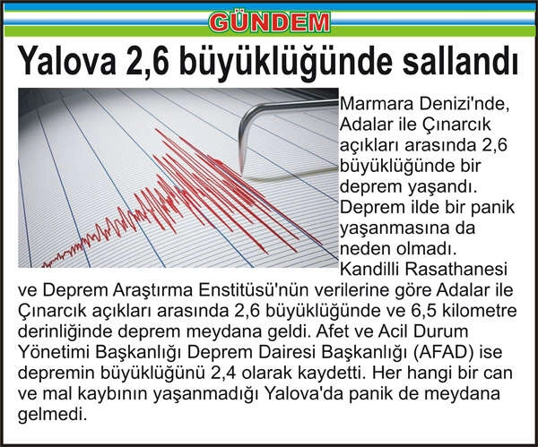 Marmara Denizi'nde, Adalar ile Çınarcık açıkları arasında 2,6 büyüklüğünde bir deprem yaşandı. Deprem ilde bir panik yaşanmasına da neden olmadı. Kandilli Rasathanesi ve Deprem Araştırma Enstitüsü'nün verilerine göre Adalar ile Çınarcık açıkları arasında 2,6 büyüklüğünde ve 6,5 kilometre derinliğinde deprem meydana geldi. Afet ve Acil Durum Yönetimi Başkanlığı Deprem Dairesi Başkanlığı (AFAD) ise depremin büyüklüğünü 2,4 olarak kaydetti. Her hangi bir can ve mal kaybının yaşanmadığı Yalova’da panik de meydana gelmedi.