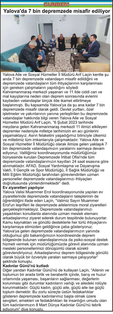 Yalova Aile ve Sosyal Hizmetler İl Müdürü Arif Laçin kentte şu anda 7 bin depremzede vatandaşın misafir edildiğini ve depremzede vatandaşların tüm ihtiyaçlarının karşılanması için gereken çalışmaların yapıldığını söyledi Kahramanmaraş merkezli yaşanan ve 11 ilde ciddi can ve mal kayıplarına neden olan deprem sonrasında evlerini kaybeden vatandaşlar birçok ilde ikamet ettirilmeye başlanmıştı. Bu kapsamda Yalova’ya da şu ana kadar 7 bin depremzede misafir olarak geldi. Devlet yurtları, özel işletmeler ve yakınlarının yanına yerleştirilen bu depremzede vatandaşlar hakkında bilgi veren Yalova Aile ve Sosyal Hizmetler Müdürü Arif Laçin, “6 Şubat 2023 tarihinde meydana gelen Kahramanmaraş merkezli 11 ilimizi etkileyen depremler nedeniyle milletçe tarihimizin en acı günlerini yaşamaktayız. Asrın felaketini yaşadığımız bilinciyle ülkemiz ve milletimiz tüm imkanlarıyla çalışmaktadır. Yalova Aile ve Sosyal Hizmetler İl Müdürlüğü olarak ilimize gelen yaklaşık 7 bin depremzede vatandaşımızın yaralarını sarmaya devam ediyoruz. Valiliğimiz koordinasyonunda müdürlüğümüz bünyesinde kurulan Depremzede İrtibat Ofisi’nde tüm depremzede vatandaşlarımızın kayıtları 24 saat esasına göre alınmaktadır. AFAD, Sosyal Yardımlaşma ve Dayanışma Vakfı, İl Gençlik ve Spor Müdürlüğü, İl Sağlık Müdürlüğü ve Milli Eğitim Müdürlüğü tarafından görevlendirilen uzman personeller depremzede vatandaşlarımızı ihtiyaçları doğrultusunda yönlendirmektedir” dedi. Ev ziyaretleri yapılıyor Yalova Valisi Muammer Erol koordinasyonunda yapılan ev ziyaretlerinde depremzede vatandaşların taleplerinin de öğrenildiğini ifade eden Laçin, “Valimiz Sayın Muammer Erol’un teşrifleri ile depremzede ailelerimize moral ziyaretleri gerçekleştirmekteyiz. Depremzede vatandaşlarımızı yaşadıkları konutlarda alanında uzman meslek elemanı arkadaşlarımız ziyaret ederek durum tespitinde bulunuyorlar. Kamu kaynakları ve gönüllü desteklerle her türlü ihtiyaçlarını karşılamaya elimizden geldiğince çaba gösteriyoruz. Yalova’ya gelen depremzede vatandaşlarımızın yanında olduğumuz gibi bakanlığımızın koordinesinde deprem bölgesinde bulunan vatandaşlarımıza da psiko-sosyal destek hizmeti vermek için müdürlüğümüzde görevli alanında uzman mesleki personellerimizi dönüşümlü olarak sürekli görevlendiriyoruz. Arkadaşlarımız deprem bölgesinde gönüllü olarak büyük bir özveriyle yaraları sarmaya çalışıyorlar” şeklinde konuştu. Kadınlar Günü’nü kutladı Diğer yandan Kadınlar Günü’nü de kutlayan Laçin, “Ailenin ve toplumun bir arada birlik ve beraberlik içinde, barış ve huzur ortamında yaşaması, başarıların sağlanması, değerlerin korunması gibi durumlar kadınların varlığı ve ailedeki rolüyle korunmaktadır. Güçlü kadın, güçlü aile, güçlü aile ise güçlü toplum demektir. Bu zorlu süreçte üstün fedakarlıklar gösteren depremzede kadınlarımız başta olmak üzere sevgileri, emekleri ve fedakârlıkları ile insanlığın umudu olan tüm kadınlarımızın 8 Mart Dünya Kadınlar Günü’nü tebrik ediyorum” diye konuştu.