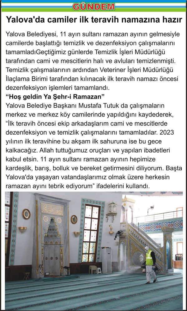 Yalova Belediyesi, 11 ayın sultanı ramazan ayının gelmesiyle camilerde başlattığı temizlik ve dezenfeksiyon çalışmalarını tamamladıGeçtiğimiz günlerde Temizlik İşleri Müdürlüğü tarafından cami ve mescitlerin halı ve avluları temizlenmişti. Temizlik çalışmalarının ardından Veteriner İşleri Müdürlüğü İlaçlama Birimi tarafından kılınacak ilk teravih namazı öncesi dezenfeksiyon işlemleri tamamlandı. “Hoş geldin Ya Şehr-i Ramazan” Yalova Belediye Başkanı Mustafa Tutuk da çalışmaların merkez ve merkez köy camilerinde yapıldığını kaydederek, “İlk teravih öncesi ekip arkadaşlarım cami ve mescitlerde dezenfeksiyon ve temizlik çalışmalarını tamamladılar. 2023 yılının ilk teravihine bu akşam ilk sahuruna ise bu gece kalkacağız. Allah tuttuğumuz oruçları ve yapılan ibadetleri kabul etsin. 11 ayın sultanı ramazan ayının hepimize kardeşlik, barış, bolluk ve bereket getirmesini diliyorum. Başta Yalova’da yaşayan vatandaşlarımız olmak üzere herkesin ramazan ayını tebrik ediyorum” ifadelerini kullandı.