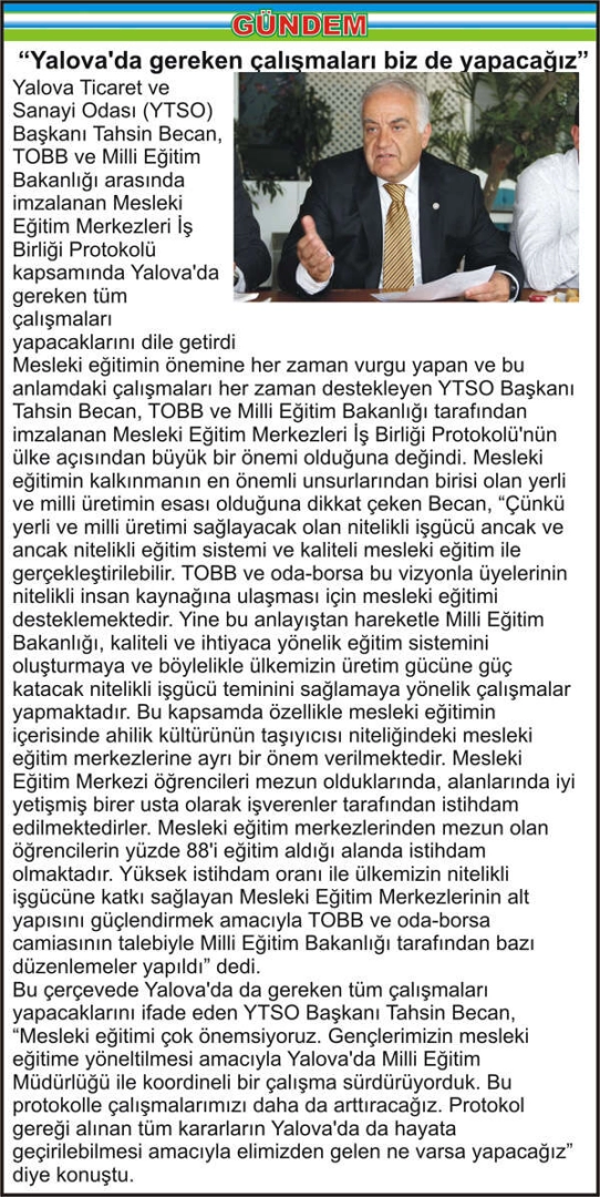 Yalova Ticaret ve Sanayi Odası (YTSO) Başkanı Tahsin Becan, TOBB ve Milli Eğitim Bakanlığı arasında imzalanan Mesleki Eğitim Merkezleri İş Birliği Protokolü kapsamında Yalova’da gereken tüm çalışmaları yapacaklarını dile getirdi
