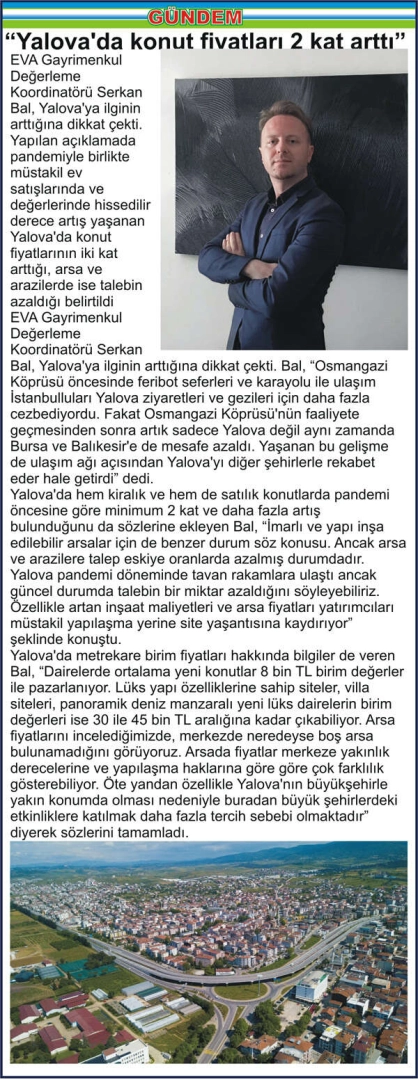 EVA Gayrimenkul Değerleme Koordinatörü Serkan Bal, Yalova’ya ilginin arttığına dikkat çekti. Yapılan açıklamada pandemiyle birlikte müstakil ev satışlarında ve değerlerinde hissedilir derece artış yaşanan Yalova’da konut fiyatlarının iki kat arttığı, arsa ve arazilerde ise talebin azaldığı belirtildi