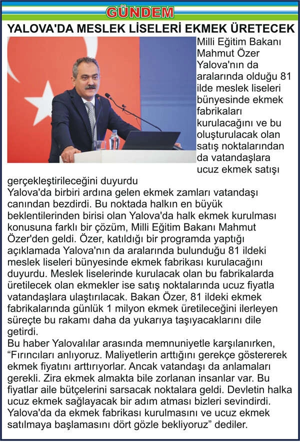 Milli Eğitim Bakanı Mahmut Özer Yalova’nın da aralarında olduğu 81 ilde meslek liseleri bünyesinde ekmek fabrikaları kurulacağını ve bu oluşturulacak olan satış noktalarından da vatandaşlara ucuz ekmek satışı gerçekleştirileceğini duyurdu Yalova’da birbiri ardına gelen ekmek zamları vatandaşı canından bezdirdi. Bu noktada halkın en büyük beklentilerinden birisi olan Yalova’da halk ekmek kurulması konusuna farklı bir çözüm, Milli Eğitim Bakanı Mahmut Özer’den geldi. Özer, katıldığı bir programda yaptığı açıklamada Yalova’nın da aralarında bulunduğu 81 ildeki meslek liseleri bünyesinde ekmek fabrikası kurulacağını duyurdu. Meslek liselerinde kurulacak olan bu fabrikalarda üretilecek olan ekmekler ise satış noktalarında ucuz fiyatla vatandaşlara ulaştırılacak. Bakan Özer, 81 ildeki ekmek fabrikalarında günlük 1 milyon ekmek üretileceğini ilerleyen süreçte bu rakamı daha da yukarıya taşıyacaklarını dile getirdi. Bu haber Yalovalılar arasında memnuniyetle karşılanırken, “Fırıncıları anlıyoruz. Maliyetlerin arttığını gerekçe göstererek ekmek fiyatını arttırıyorlar. Ancak vatandaşı da anlamaları gerekli. Zira ekmek almakta bile zorlanan insanlar var. Bu fiyatlar aile bütçelerini sarsacak noktalara geldi. Devletin halka ucuz ekmek sağlayacak bir adım atması bizleri sevindirdi. Yalova’da da ekmek fabrikası kurulmasını ve ucuz ekmek satılmaya başlamasını dört gözle bekliyoruz” dediler.