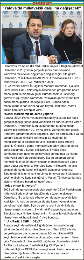Demokrasi ve Atılım (DEVA) Partisi Yalova İl Başkanı Mehmet Demirhan 2023 yılında gerçekleşecek olan seçimde Yalova’da milletvekili dağılımının değişeceğini dile getirdi. Demirhan, “1 milletvekilini AK Parti, 1 milletvekilini CHP ve 3. milletvekilini ise DEVA Partisi alır” dedi DEVA Partisi Yalova İl Başkanı Mehmet Demirhan, Çalışan Gazeteciler Günü dolayısıyla düzenlenen programda basın mensupları ile bir araya geldi. Burada basının üstlendiği göreve vurgu yapan Demirhan, Yalova’da görev yapan tüm basın mensuplarına ise teşekkür etti. Burada basın mensuplarının sorularını da yanıtlayan Demirhan, merak edilen konulara cevaplar verdi. “Genel Merkezimiz ne derse yaparız” Burada DEVA Partisi’nin milletvekili adaylık sürecinin nasıl gerçekleşeceği konusunda yöneltilen bir soruya cevap veren Demirhan, “Partimizin kuruluş gününden bugüne kadar Yalova teşkilatlarının 30. ayına girdik. Zor şartlardan geçtik. Pandemi şartlarında zoru başardık. Yeni bir parti kurduk ve bu partinin özgün kimliğini şehrimizin 43 köyünde, 51 mahallesinde, 8 beldesinde ve 6 ilçesinde tesis etmeye çalıştık. Öncelikle genel merkezimizin aday adaylığı süreci daha başlamadı. Süreci bekliyoruz. 6 masa önce cumhurbaşkanı adayını belirleyecek sonrasında da illerde milletvekili adayları belirlenecek. Biz bu anlamda genel merkezimiz ortak bir aday çıkacak o desteklenecek derse ortak adayı destekleriz. Her parti kendi milletvekili ile yola çıkacak derse de kendi milletvekili adayımızı çıkartırız. Elbette gönül ister ki yeni kurulmuş bir siyasi parti tek başına seçime girsin ve kendisini görsün. Malum Türkiye şartlarında sistem ittifaklara bizleri zorluyor” dedi. “Aday olmak istiyorum” 2023 yılında gerçekleşecek olan seçimde DEVA Partisi’nden milletvekili adayı olmak istediğini de sözlerine ekleyen Demirhan, “Bu anlamda elbette ben de aday adaylığı için istekliyim. Ancak bu anlamda elbette kararı verecek olan genel merkezimizdir. Ben bu şehre resmi bir kimlikle de hizmet etmek istiyorum. 9 yıldır aktif siyaset hayatındayım. Birçok konuda ilimize hizmet ettim. Ama milletvekili olarak da hizmet vermek hayalindeyim” diye konuştu. “1 AK Parti, 1 CHP, 1 DEVA” Burada seçimde milletvekilliği dağılımının nasıl olacağı yönünde öngörüsü sorulan Demirhan, “Ben 2023 yılında gerçekleşecek olan cumhurbaşkanlığı ve milletvekilliği seçimlerinde eski tablonun oluşacağını sanmıyorum. Bana göre Yalova’da 3 milletvekilliği dağılacak. Bunlardan birisini AK Parti çıkartacak. 1 milletvekilliği CHP’ye ve 3. milletvekilliği ise DEVA Partisine gidecek. Halkımızın sahada bize gösterdiği teveccüh de bunu bizlere net olarak gösteriyor” şeklinde konuştu.