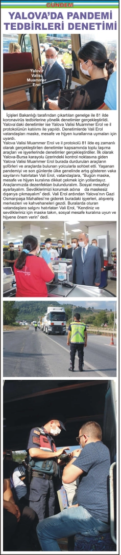YALOVA’DA PANDEMİ TEDBİRLERİ DENETİMİ İçişleri Bakanlığı tarafından çıkartılan genelge ile 81 ilde koronavirüs tedbirlerine yönelik denetimler gerçekleştirildi. Yalova’daki denetimler ise Yalova Valisi Muammer Erol ve il protokolünün katılımı ile yapıldı. Denetimlerde Vali Erol vatandaşları maske, mesafe ve hijyen kurallarına uymaları için uyardı. Yalova Valisi Muammer Erol ve il protokolü 81 ilde eş zamanlı olarak gerçekleştirilen denetimler kapsamında toplu taşıma araçları ve işyerlerinde denetimler gerçekleştirdiler. İlk olarak Yalova-Bursa karayolu üzerindeki kontrol noktasına giden Yalova Valisi Muammer Erol burada durdurulan araçların şoförleri ve araçlarda bulunan yolcularla sohbet etti. Yaşanan pandemiyi ve son günlerde ülke genelinde artış gösteren vaka sayılarını hatırlatan Vali Erol, vatandaşlara, “Bugün maske, mesafe ve hijyen kuralına dikkat çekmek için yollardayız. Araçlarımızda dezenfektan bulunduralım. Sosyal mesafeyi ayarlayalım. Sevdiklerimizi korumak adına da maskesiz dışarıya çıkmayalım” dedi. Vali Erol ardından Yalova’nın Gazi Osmanpaşa Mahallesi’ne giderek buradaki işyerleri, alışveriş merkezleri ve kahvehaneleri gezdi. Buralarda oturan vatandaşlara salgını hatırlatan Vali Erol, “Kendiniz ve sevdikleriniz için maske takın, sosyal mesafe kuralına uyun ve hijyene önem verin” dedi.