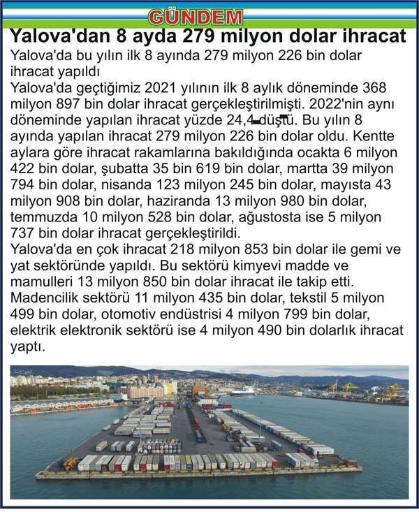 Yalova’da bu yılın ilk 8 ayında 279 milyon 226 bin dolar ihracat yapıldı Yalova'da geçtiğimiz 2021 yılının ilk 8 aylık döneminde 368 milyon 897 bin dolar ihracat gerçekleştirilmişti. 2022’nin aynı döneminde yapılan ihracat yüzde 24,4 düştü. Bu yılın 8 ayında yapılan ihracat 279 milyon 226 bin dolar oldu. Kentte aylara göre ihracat rakamlarına bakıldığında ocakta 6 milyon 422 bin dolar, şubatta 35 bin 619 bin dolar, martta 39 milyon 794 bin dolar, nisanda 123 milyon 245 bin dolar, mayısta 43 milyon 908 bin dolar, haziranda 13 milyon 980 bin dolar, temmuzda 10 milyon 528 bin dolar, ağustosta ise 5 milyon 737 bin dolar ihracat gerçekleştirildi. Yalova’da en çok ihracat 218 milyon 853 bin dolar ile gemi ve yat sektöründe yapıldı. Bu sektörü kimyevi madde ve mamulleri 13 milyon 850 bin dolar ihracat ile takip etti. Madencilik sektörü 11 milyon 435 bin dolar, tekstil 5 milyon 499 bin dolar, otomotiv endüstrisi 4 milyon 799 bin dolar, elektrik elektronik sektörü ise 4 milyon 490 bin dolarlık ihracat yaptı.