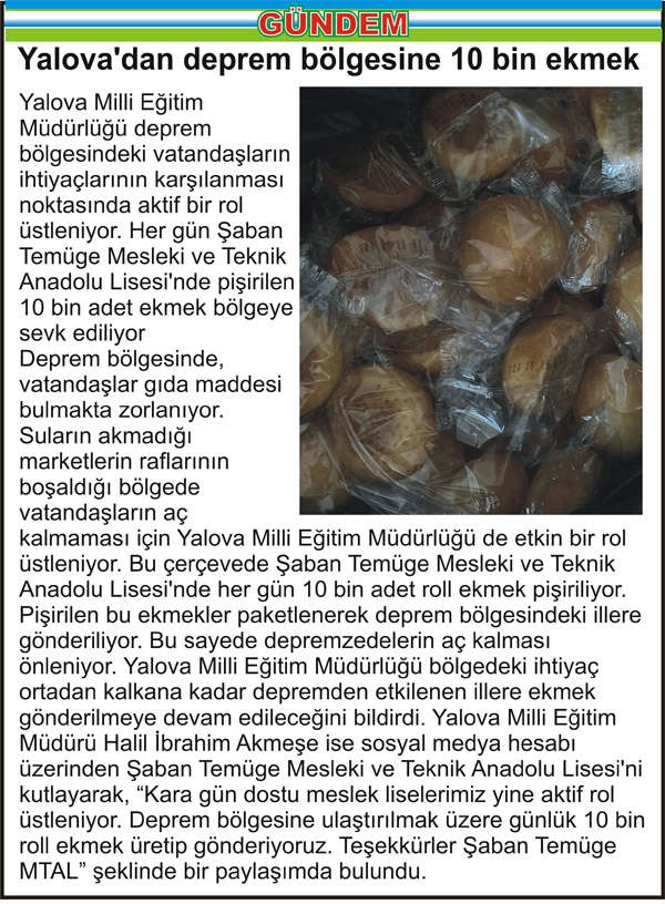 Yalova Milli Eğitim Müdürlüğü deprem bölgesindeki vatandaşların ihtiyaçlarının karşılanması noktasında aktif bir rol üstleniyor. Her gün Şaban Temüge Mesleki ve Teknik Anadolu Lisesi’nde pişirilen 10 bin adet ekmek bölgeye sevk ediliyor