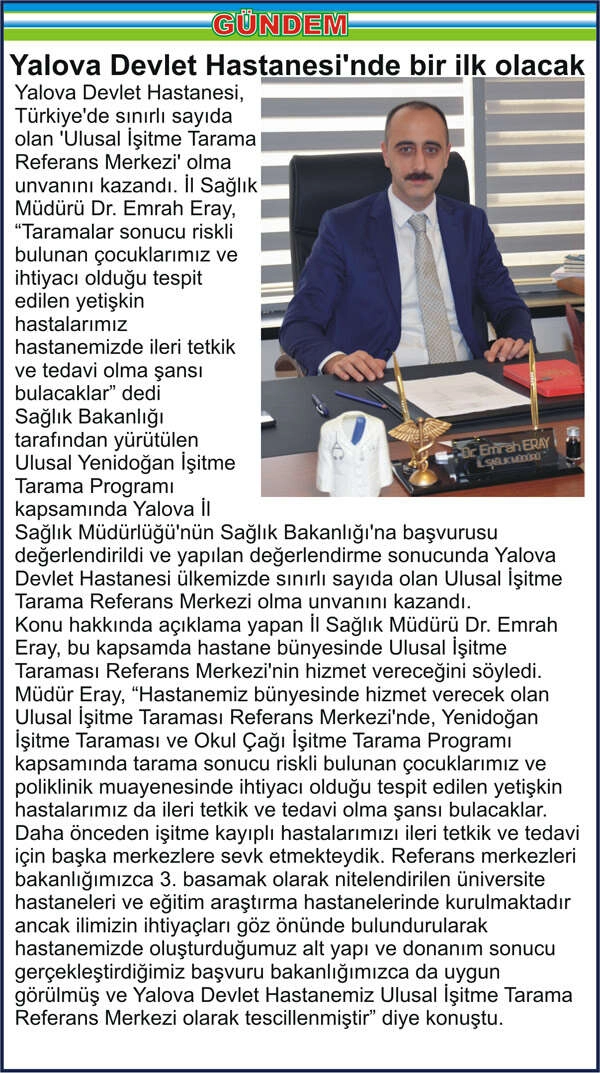 Yalova Devlet Hastanesi, Türkiye’de sınırlı sayıda olan ‘Ulusal İşitme Tarama Referans Merkezi’ olma unvanını kazandı. İl Sağlık Müdürü Dr. Emrah Eray, “Taramalar sonucu riskli bulunan çocuklarımız ve ihtiyacı olduğu tespit edilen yetişkin hastalarımız hastanemizde ileri tetkik ve tedavi olma şansı bulacaklar” dedi Sağlık Bakanlığı tarafından yürütülen Ulusal Yenidoğan İşitme Tarama Programı kapsamında Yalova İl Sağlık Müdürlüğü’nün Sağlık Bakanlığı’na başvurusu değerlendirildi ve yapılan değerlendirme sonucunda Yalova Devlet Hastanesi ülkemizde sınırlı sayıda olan Ulusal İşitme Tarama Referans Merkezi olma unvanını kazandı. Konu hakkında açıklama yapan İl Sağlık Müdürü Dr. Emrah Eray, bu kapsamda hastane bünyesinde Ulusal İşitme Taraması Referans Merkezi’nin hizmet vereceğini söyledi. Müdür Eray, “Hastanemiz bünyesinde hizmet verecek olan Ulusal İşitme Taraması Referans Merkezi’nde, Yenidoğan İşitme Taraması ve Okul Çağı İşitme Tarama Programı kapsamında tarama sonucu riskli bulunan çocuklarımız ve poliklinik muayenesinde ihtiyacı olduğu tespit edilen yetişkin hastalarımız da ileri tetkik ve tedavi olma şansı bulacaklar. Daha önceden işitme kayıplı hastalarımızı ileri tetkik ve tedavi için başka merkezlere sevk etmekteydik. Referans merkezleri bakanlığımızca 3. basamak olarak nitelendirilen üniversite hastaneleri ve eğitim araştırma hastanelerinde kurulmaktadır ancak ilimizin ihtiyaçları göz önünde bulundurularak hastanemizde oluşturduğumuz alt yapı ve donanım sonucu gerçekleştirdiğimiz başvuru bakanlığımızca da uygun görülmüş ve Yalova Devlet Hastanemiz Ulusal İşitme Tarama Referans Merkezi olarak tescillenmiştir” diye konuştu.